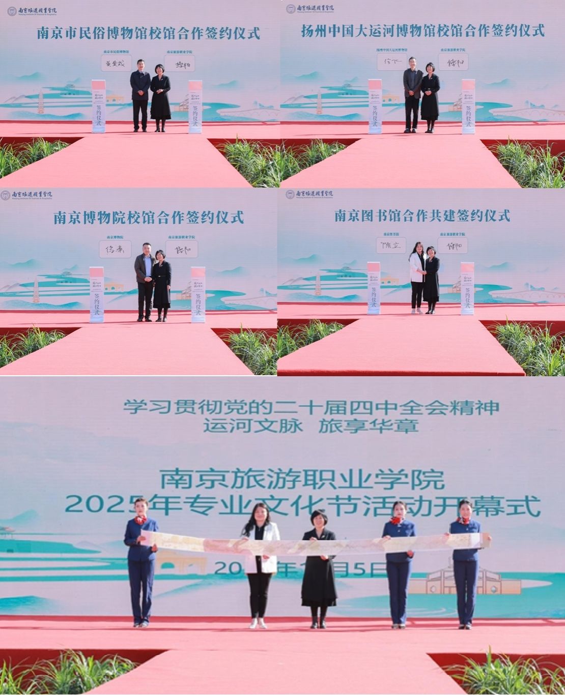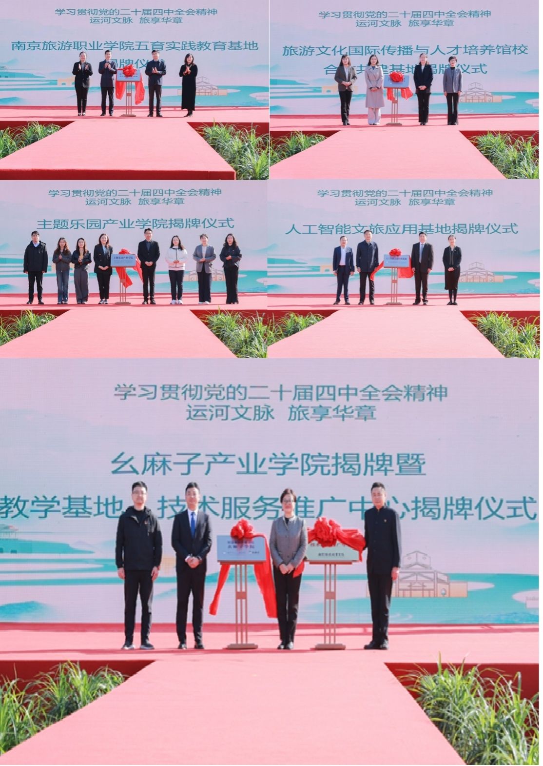 开幕式上,扬州中国大运河博物馆副馆长徐飞表示,将深化馆校资源对接,为数智文旅人才培养提供支撑。五育实践教育基地、人工智能文旅应用基地等5个校企合作基地依次揭牌,学院与南京市民俗博物馆、南京中国科举博物馆、江苏天目湖旅游股份有限公司、广州市问途信息技术有限公司及幺麻子食品股份有限公司等多家文博机构及行业领军企业,围绕民俗非遗传承、旅游文化国际传播、主题乐园产业发展、人工智能文旅应用及烹饪餐饮创新等领域,共建多个实践教育基地、产业学院及合作平台,通过深化馆校合作与产教融合,协同开展课程开发、实践教学、科研创新及人才培养,构建多元协同的育人共同体,助力文旅产业高质量发展与优秀文化的国际传播。