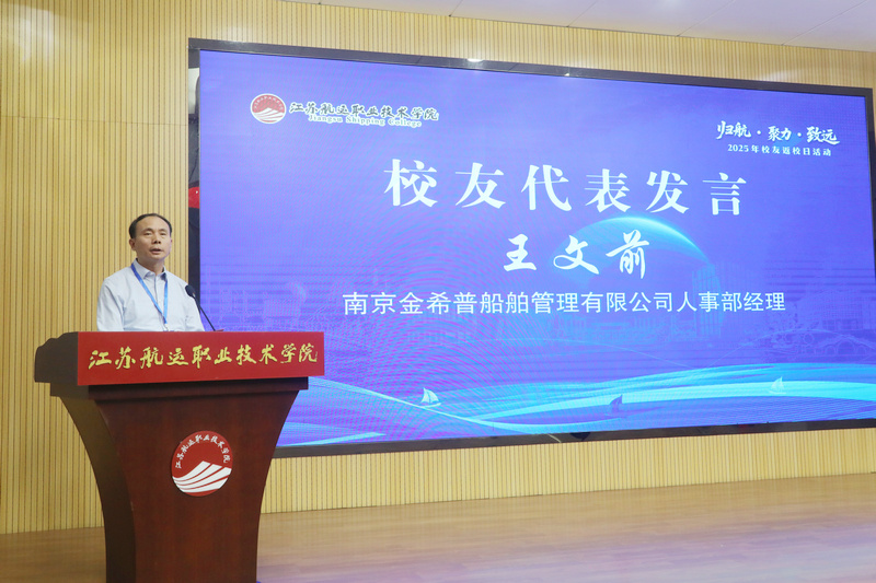 校友代表、海驾8631班毕业生、南京金希普船舶管理有限公司人事部经理王文前发言。他深情回忆了在校求学的美好时光,分享了在行业奋斗的宝贵经验,表达了对母校悉心培养的感恩之情与对母校未来发展的美好祝愿。发言真挚动人,尽显赤子之心,生动诠释了“母校与校友命运与共”的深厚情谊。
