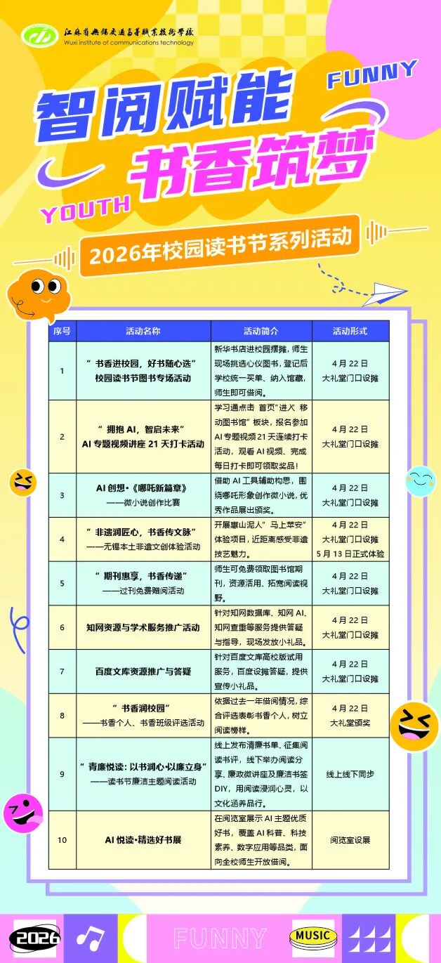 全民阅读正当时,书香校园启新程。为积极响应全民阅读工作部署,深化书香校园建设,让人工智能为阅读注入新活力,4月22日下午,江苏省无锡交通高等职业技术学校2026年校园读书节正式拉开帷幕!