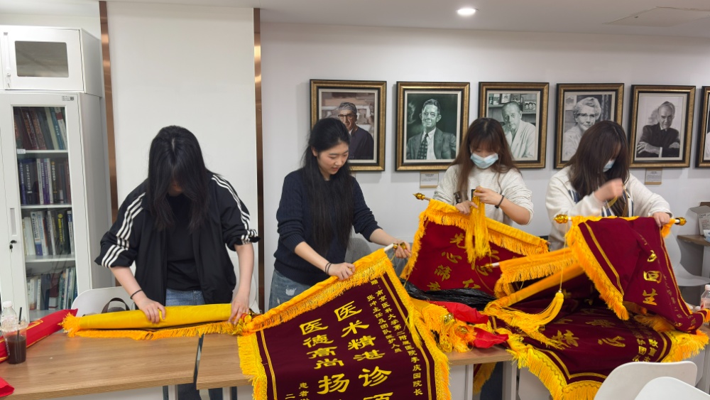 从病房到公共区域,劳动实践全面铺开。学生们分组整理图书角、清洁病区环境、归类库房耗材,细致规整“心佑工程”荣誉锦旗。一面面锦旗背后,是团队十余年深入偏远地区、救助 2400 余名先心病患儿的坚守与奉献。学生们在劳动中触摸时代楷模精神,深刻体会到 “劳动不仅是体力付出,更是精神洗礼”,在躬身实践中涵养奉献品格、坚定价值追求。