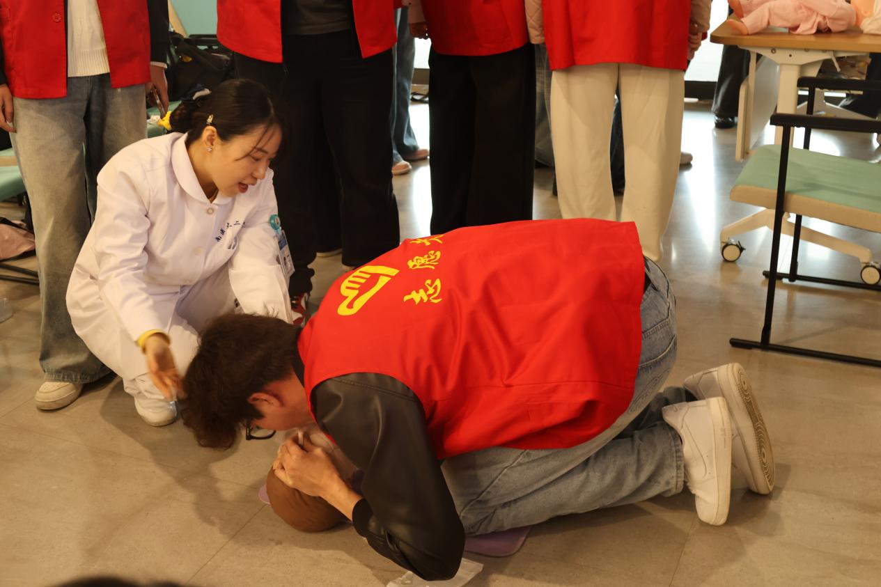 除艺术疗愈外,课程兼顾实用技能培养,助力学生提升社会服务综合能力。4月23日上午,急诊科医护人员手把手教学,学生们系统学习心肺复苏(CPR)、AED 使用、海姆立克急救法等核心技能,逐一实操考核、熟练掌握应急处置本领。下午,大家化身门诊志愿者,在自助机区域耐心指导患者挂号、缴费,重点帮扶老年群体跨越“数字鸿沟”,有效缓解就诊高峰期引导压力。从艺术疗愈到急救实训,从病区劳动到志愿服务,学生们以多元角色参与医院运营,展现新时代艺术学子的专业素养与责任担当。