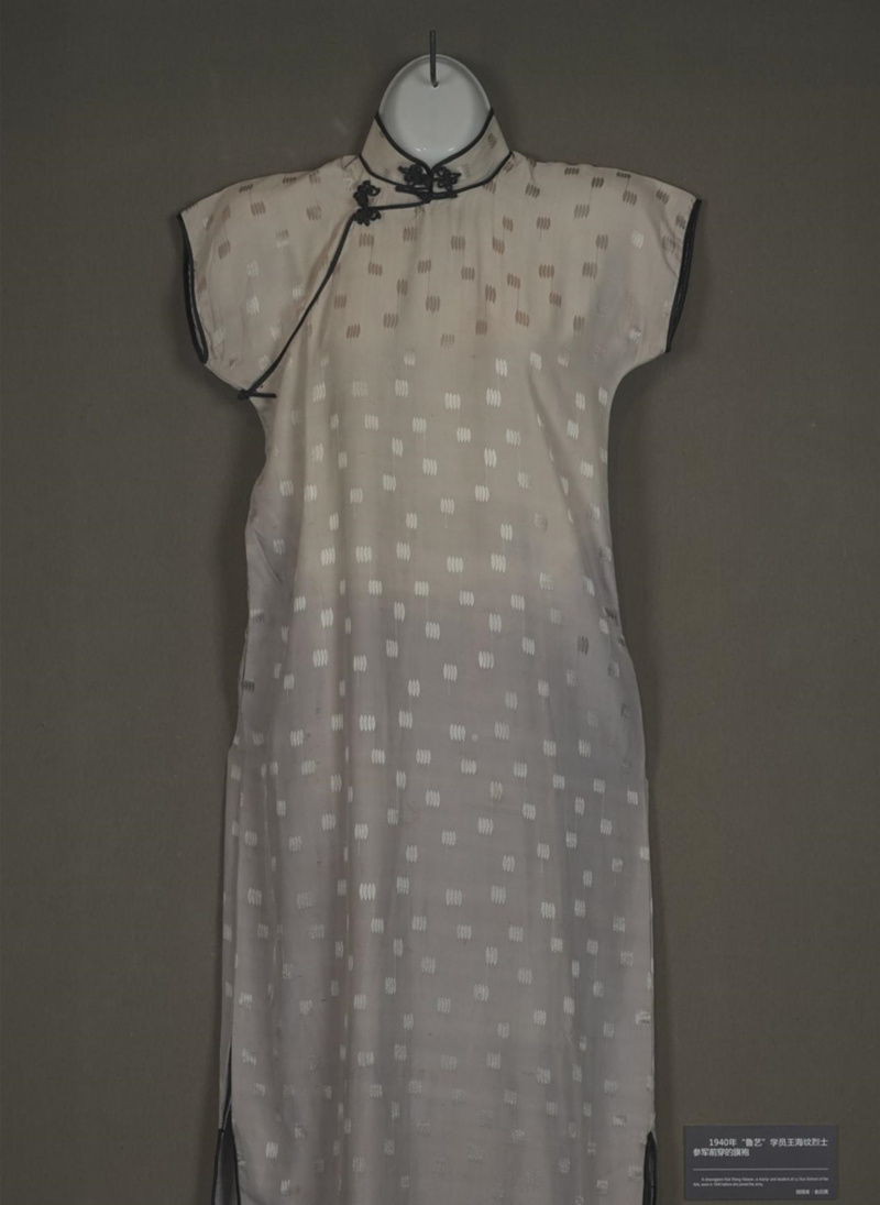 走进新四军纪念馆,很多观众会被一件旗袍所吸引,只见旗袍丝质面料素雅纯净,黑色锁边针脚细密,裙摆褶痕清晰可见。参观者忍不住驻足沉思,想象着它的主人生前的英姿。