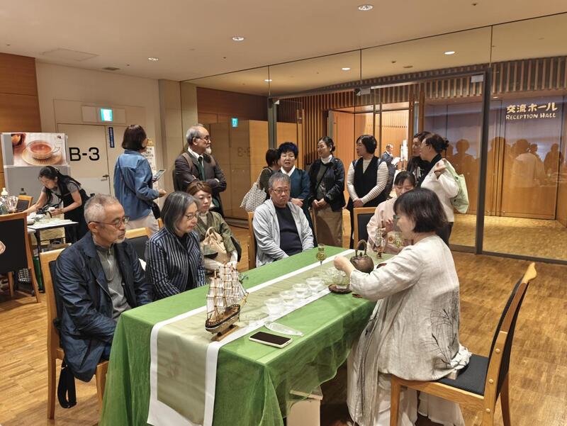 此次亮相世界绿茶大会,张义香将研培成果与地方非遗技艺深度融合,携“绿葵云雾”“猴香红”“流苏糯米花”等多款特色茶品及传统冲泡技艺赴会。在艺术中心中国特色茶品交流区,她的团队以素色茶席铺陈、磨砂琉璃大碗为茶具,搭配专属视频与宣传册,生动呈现了云雾茶的历史渊源及她二十余年的传承历程。其中重点展示的“绿葵云雾”,是她突破传统云雾茶“条索紧结”形制的匠心之作——干茶如葵籽饱满莹润,冲泡后叶底似雀舌轻展,茶汤清冽带兰花香,回甘悠长,该茶曾获2011年中国(上海)国际茶业博览会“中国名茶”金奖及第九届“中茶杯”全国名优茶评比一等奖。展会期间,“绿葵云雾”的清香与琉璃茶具的东方美学吸引众多日本茶客驻足,中日茶人围绕制茶技艺与产业发展,以茶交友,以茶敬友,以茶敦亲。