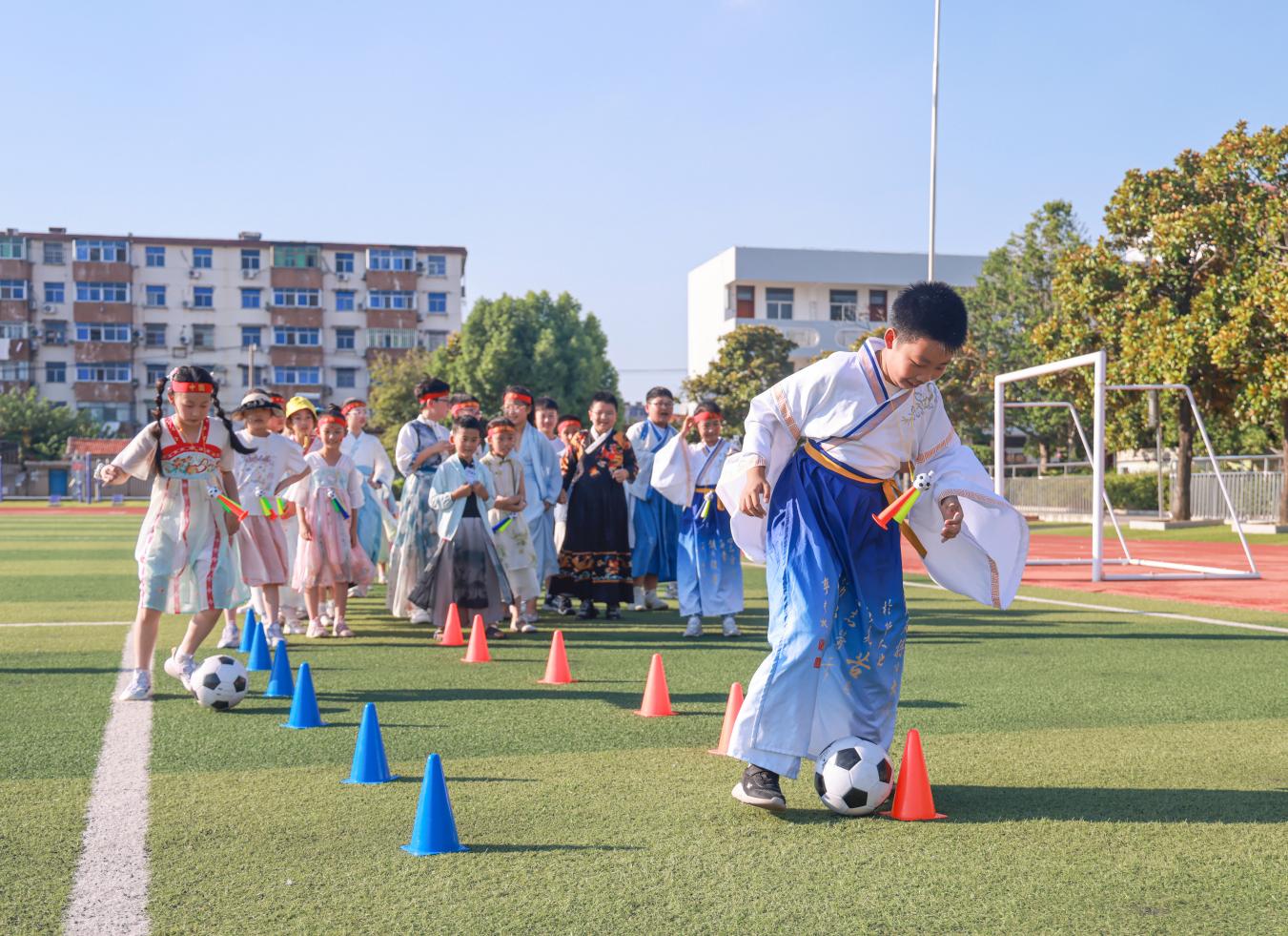 活动以丰富文物为载体,搭建古今对话的桥梁。“花团锦蹴”将传统团花纹样与现代足球创意结合,孩子们在汉服蹴鞠中感悟协作精神;“金石为开”通过抗战文物触摸红色记忆,激发爱国情怀;“钟鸣鼎食”借助编钟等礼器,让学生学习佾舞,体悟礼仪之道。