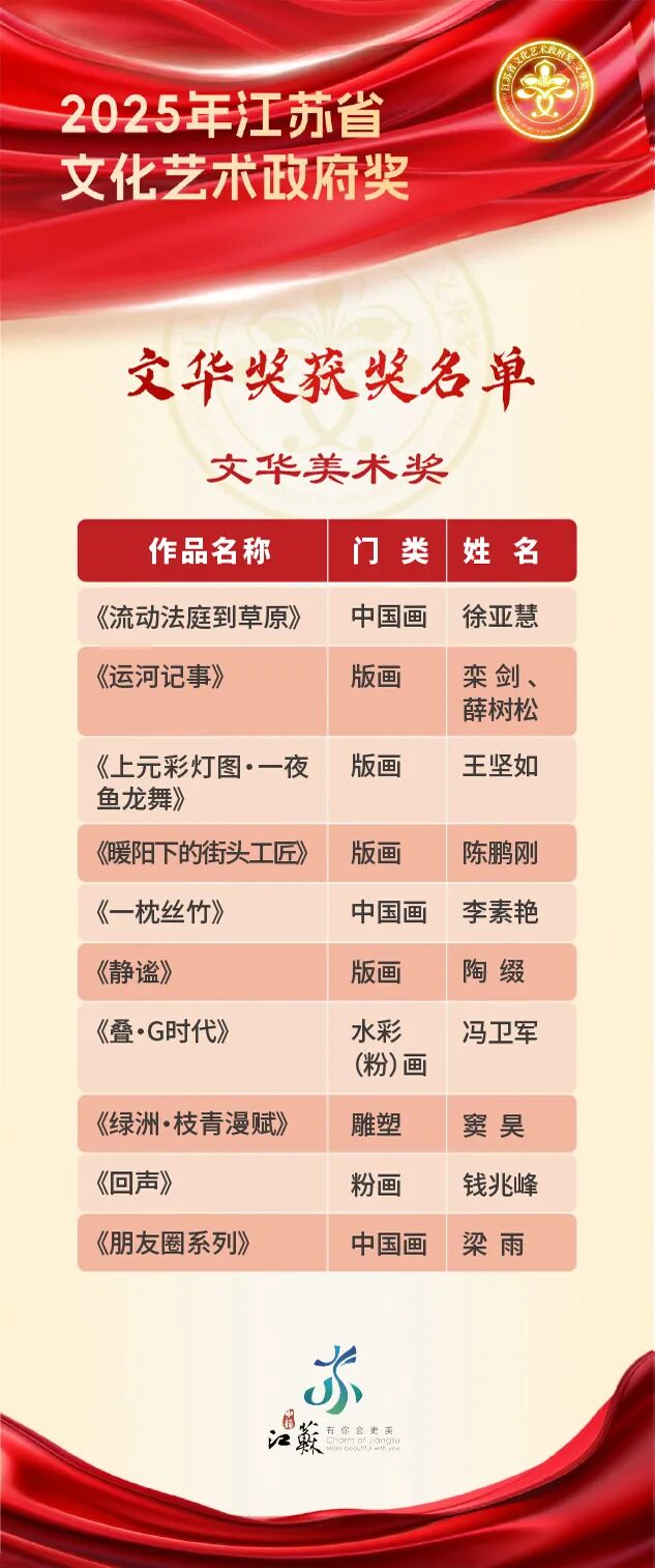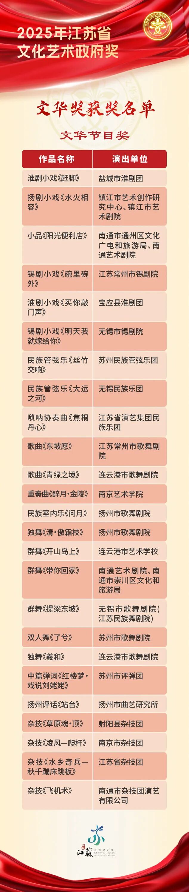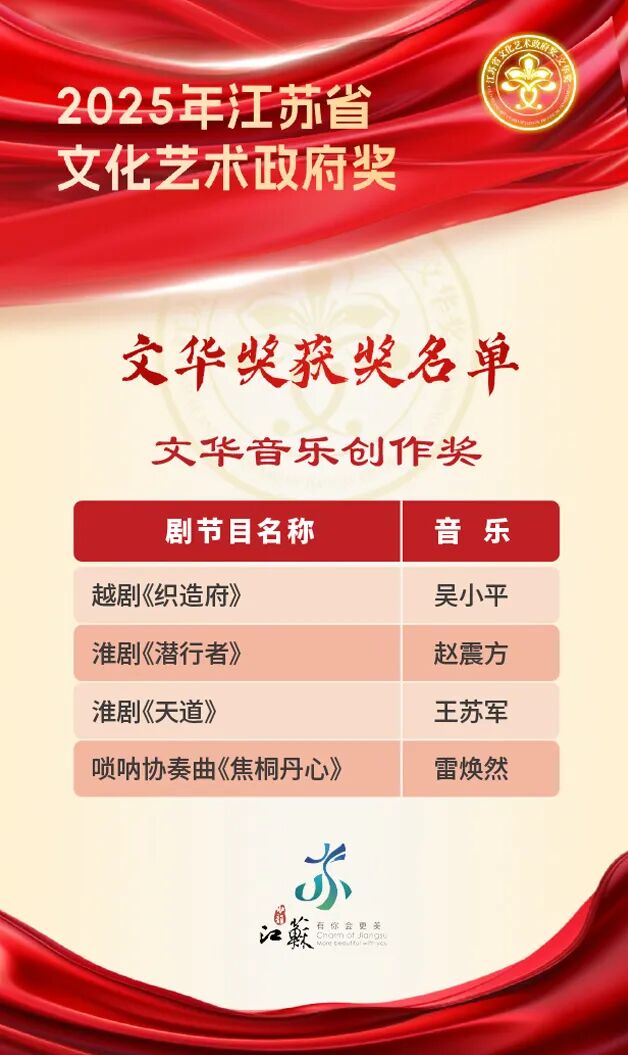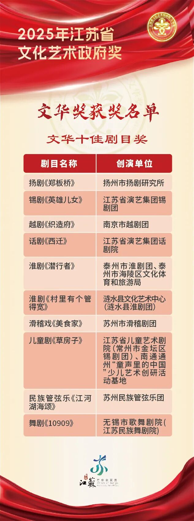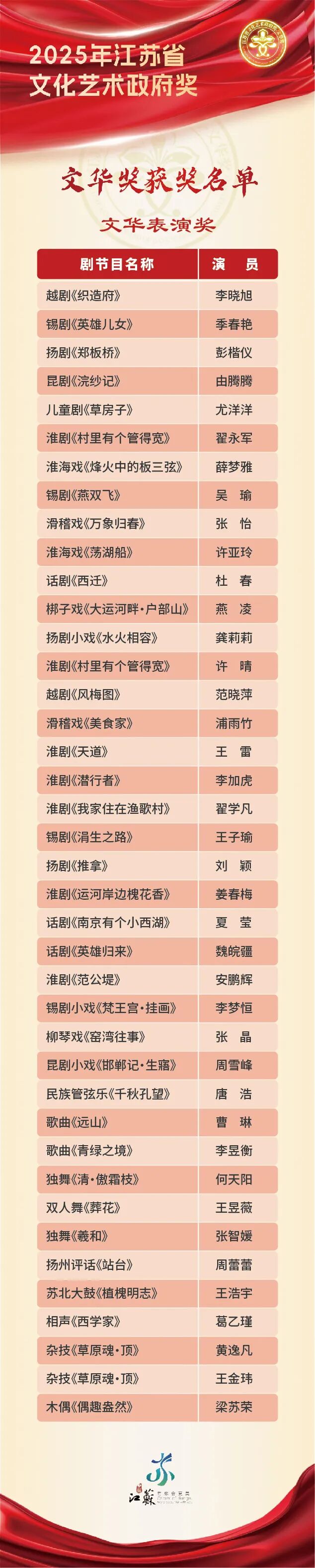 为促进江苏艺术创作繁荣发展,推动公共文化服务提质增效,更好满足人民群众精神文化需求,今年5月至11月,省文化和旅游厅会同省人力资源和社会保障厅组织开展了2025年江苏省文化艺术政府奖文华奖、五星工程奖评选活动。