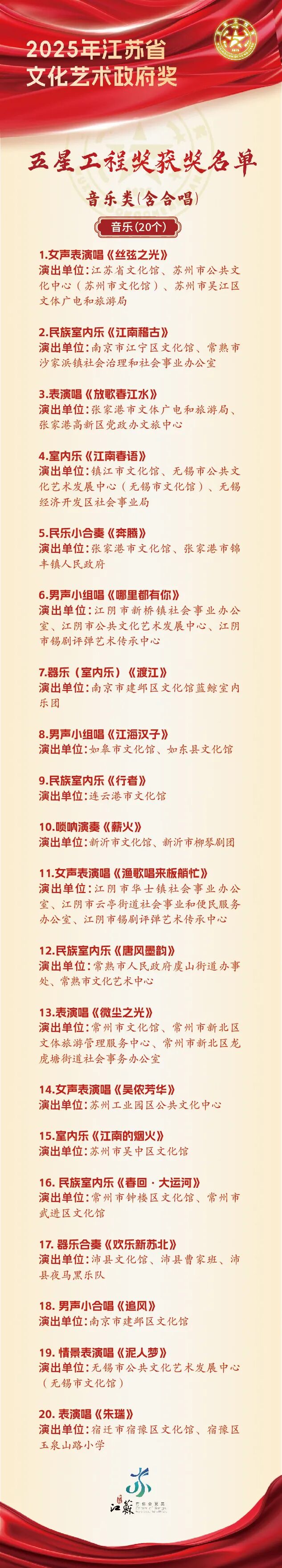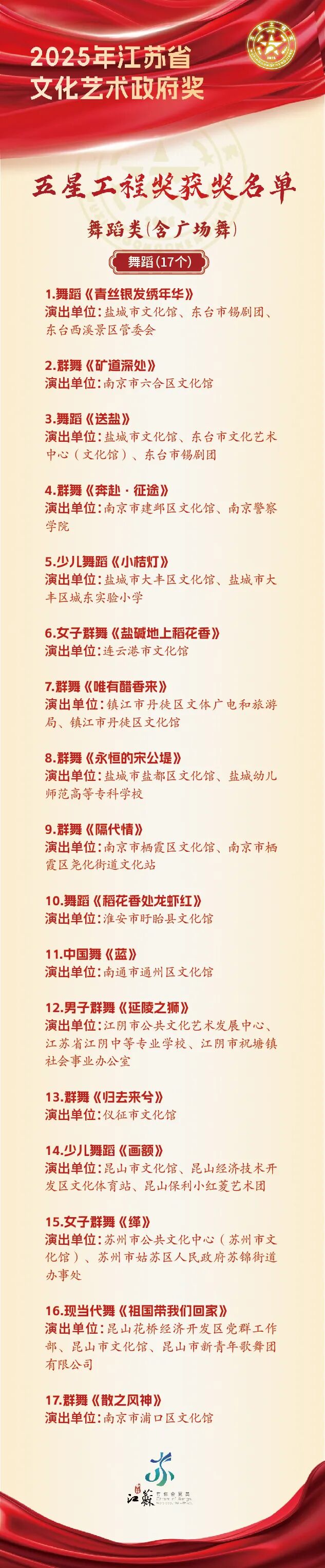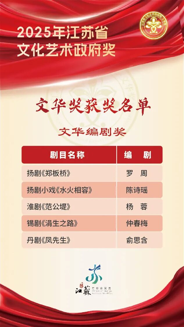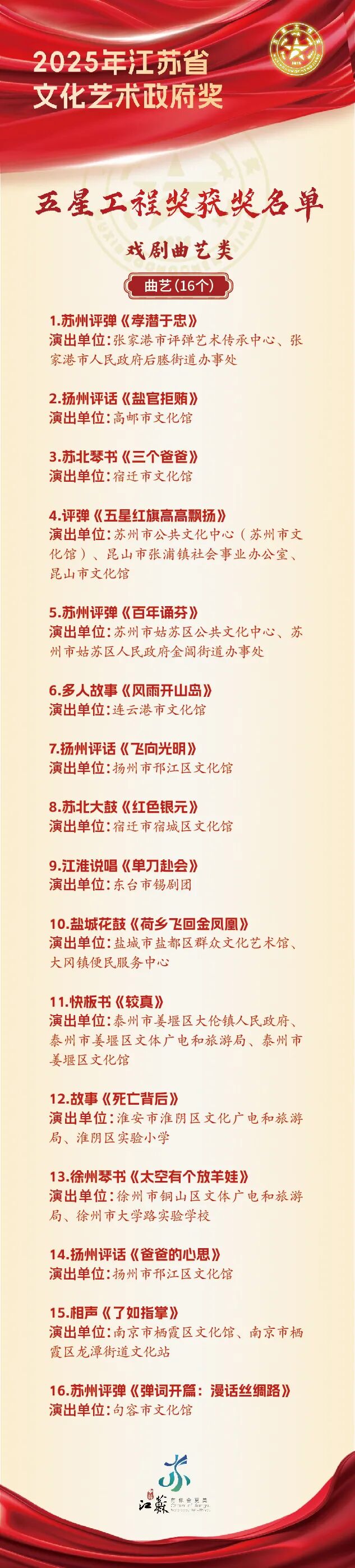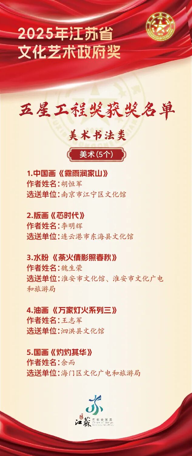为促进江苏艺术创作繁荣发展,推动公共文化服务提质增效,更好满足人民群众精神文化需求,今年5月至11月,省文化和旅游厅会同省人力资源和社会保障厅组织开展了2025年江苏省文化艺术政府奖文华奖、五星工程奖评选活动。