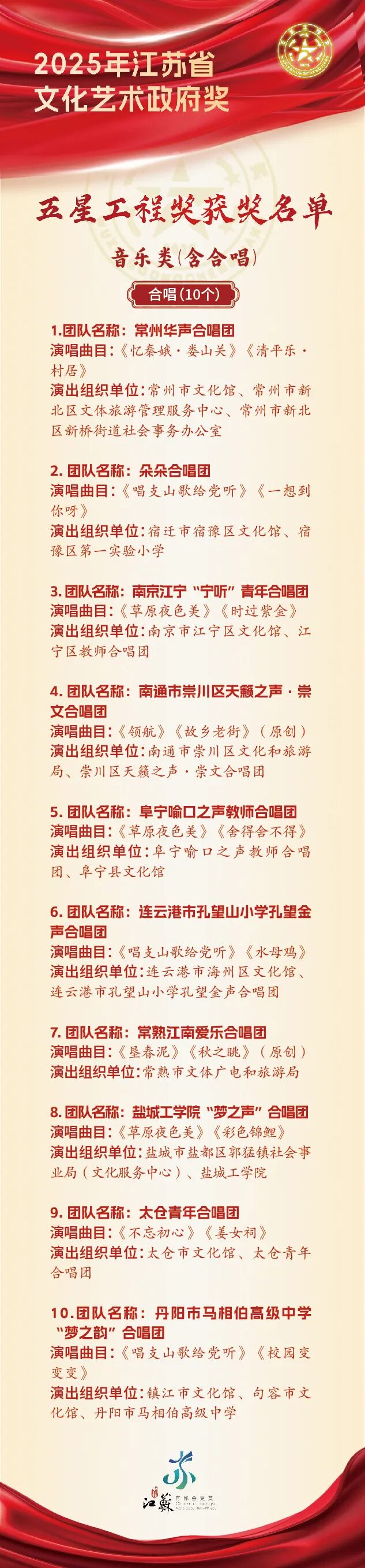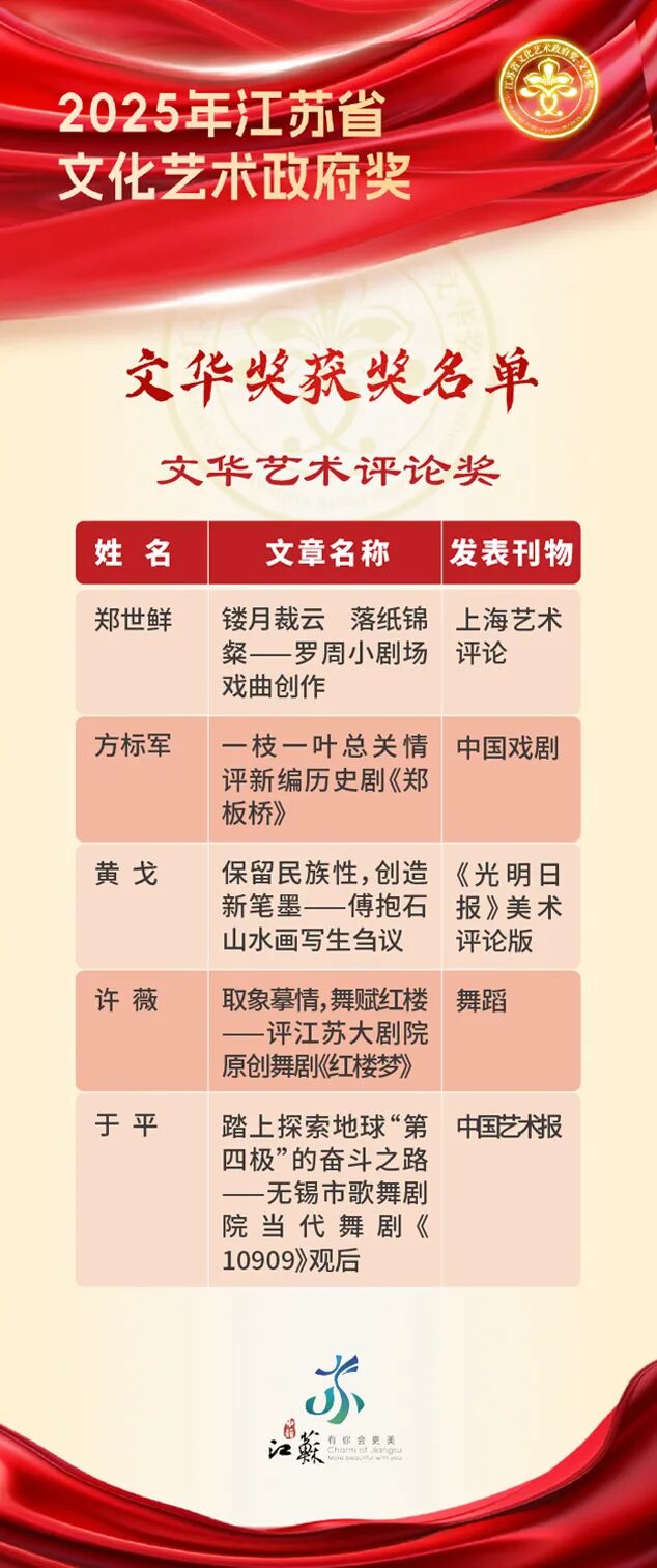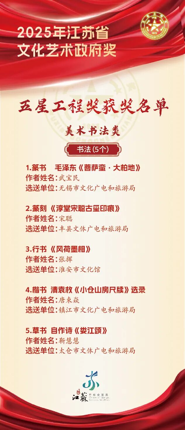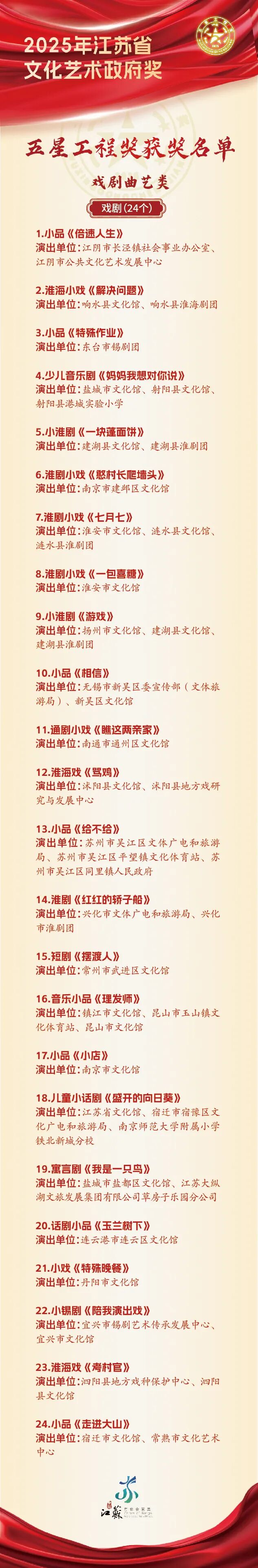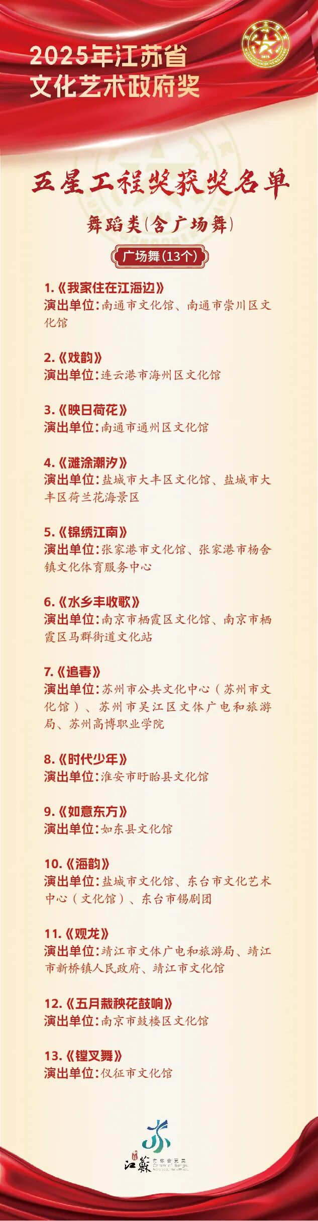 为促进江苏艺术创作繁荣发展,推动公共文化服务提质增效,更好满足人民群众精神文化需求,今年5月至11月,省文化和旅游厅会同省人力资源和社会保障厅组织开展了2025年江苏省文化艺术政府奖文华奖、五星工程奖评选活动。