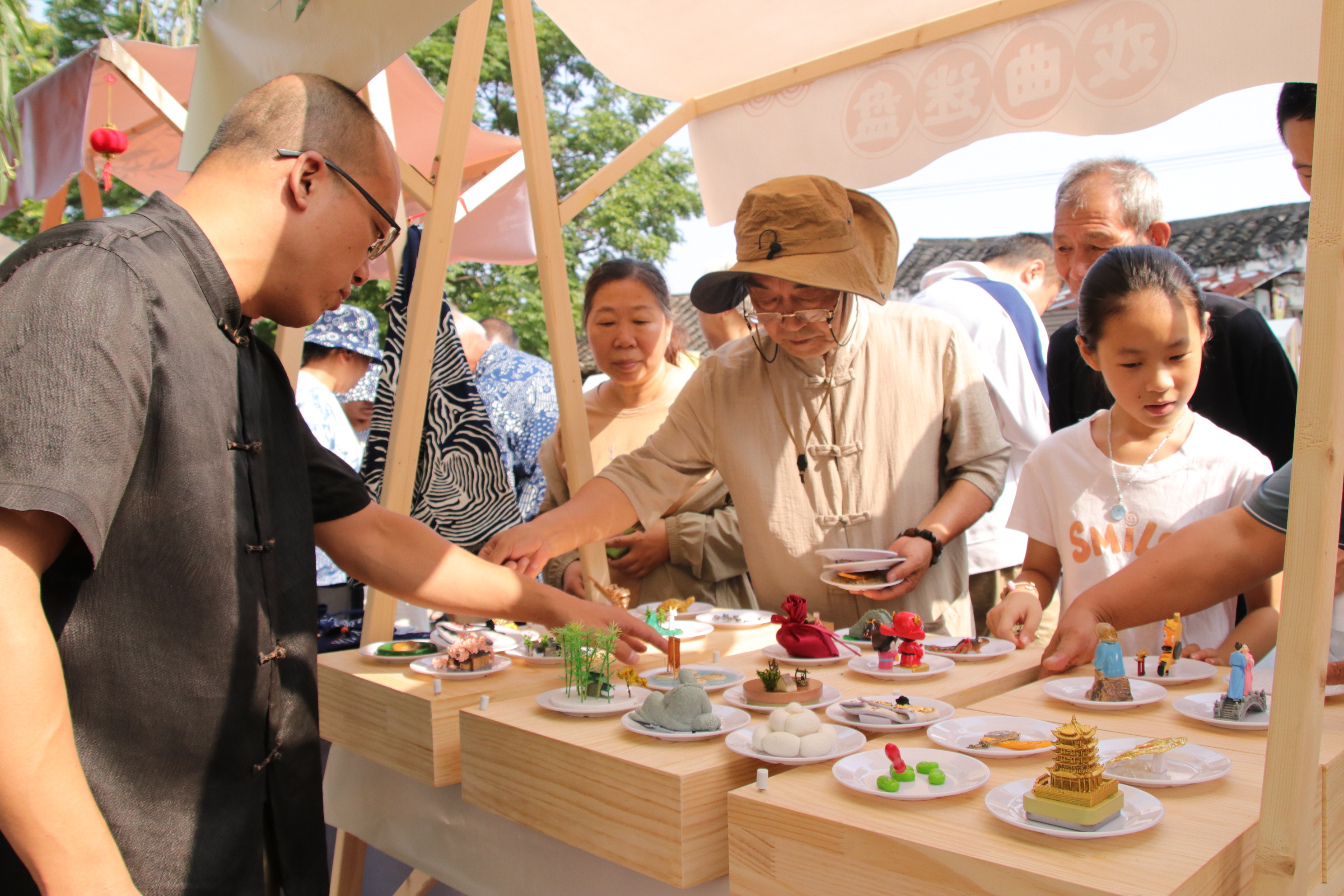 非遗市集同样人气十足。23个非遗摊位沿街排开,既有新中腐乳、白蒲茶干、兴仁崔记猪头肉、铭中月花露烧、西亭脆饼等南通特色非遗美食,也汇聚了扎染、漆扇、戏曲迷盘、蓝印花布、钩针编织等非遗手工项目。非遗传承人现场讲解并演示制作过程,不少家长带着孩子动手体验,沉浸式感受老手艺的魅力。一位带着孩子观赏石港戏曲迷盘的游客表示:“特地带孩子来了解我们本土特色的非遗技艺,没想到一个小小的集市汇聚了这么多非遗的展陈,非常了不起。”