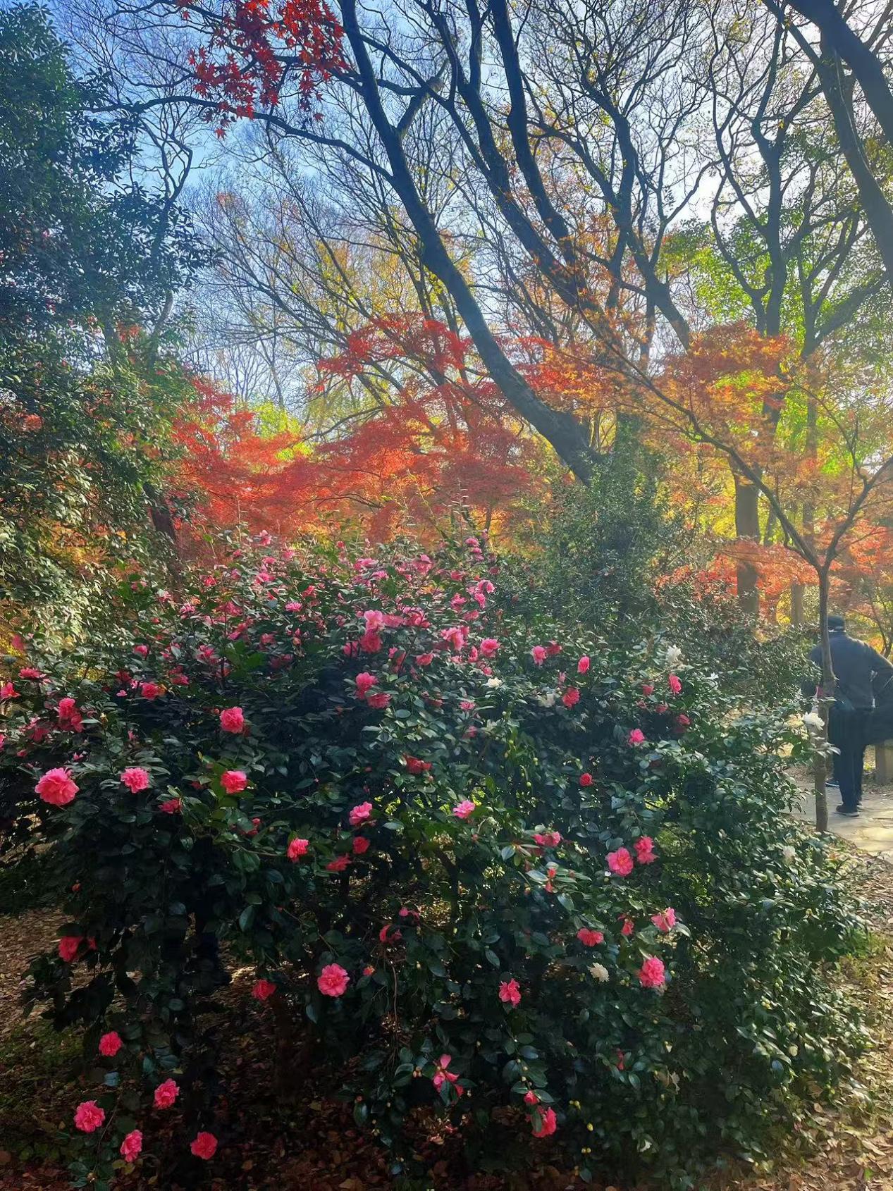 红枫岗的山坡上,成片的枫叶如火如荼,尽显雄浑气势。更妙的是,岗上正值盛花期的茶梅与红叶相映成趣,红的热烈、粉的娇嫩,为这幅冬日画卷增添了更多灵动色彩,实现了“刚柔相济”的绝佳观赏效果。