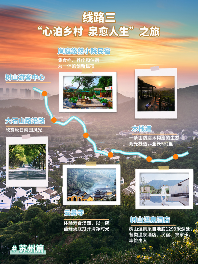 漫步3公里观光木栈道,途经苏州图书馆树山分馆,在书香中感受“山含画意”;在树山温泉酒店,体验以五音命名的养生温泉。深度体验树山村“天然氧吧+中医药乡”的独特魅力。