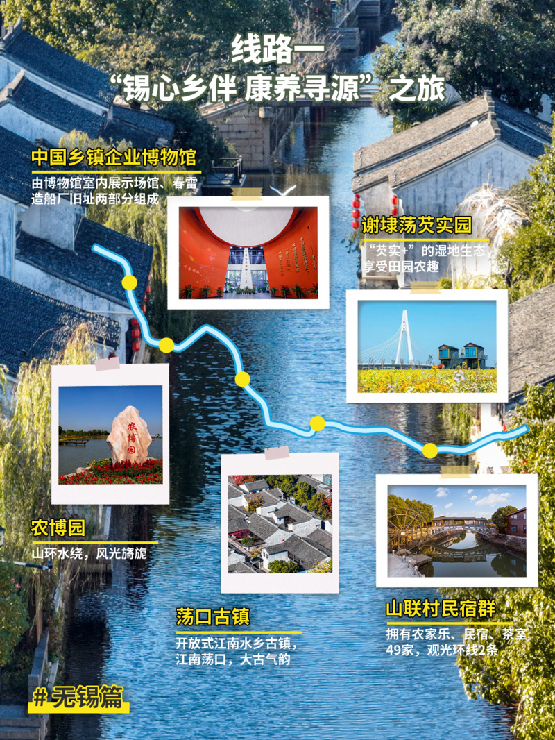 推荐点位:中国乡镇企业博物馆→农博园→谢埭荡芡实园→荡口古镇→山联村民宿群
