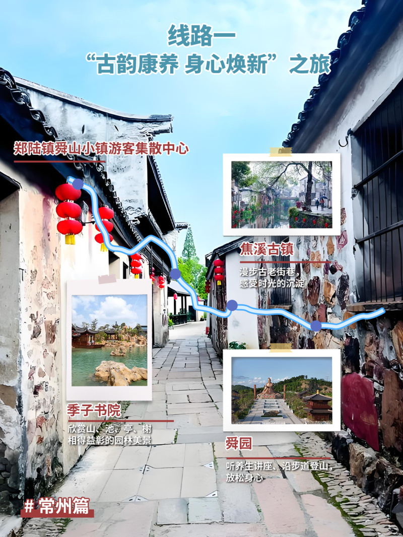 推荐点位:郑陆镇舜山小镇游客集散中心→季子书院→焦溪古镇→舜园