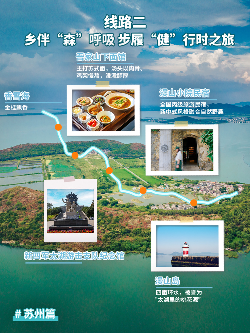 推荐点位:香雪海→吾家山下面馆→新四军太湖游击支队纪念馆→漫山小院民宿→漫山岛