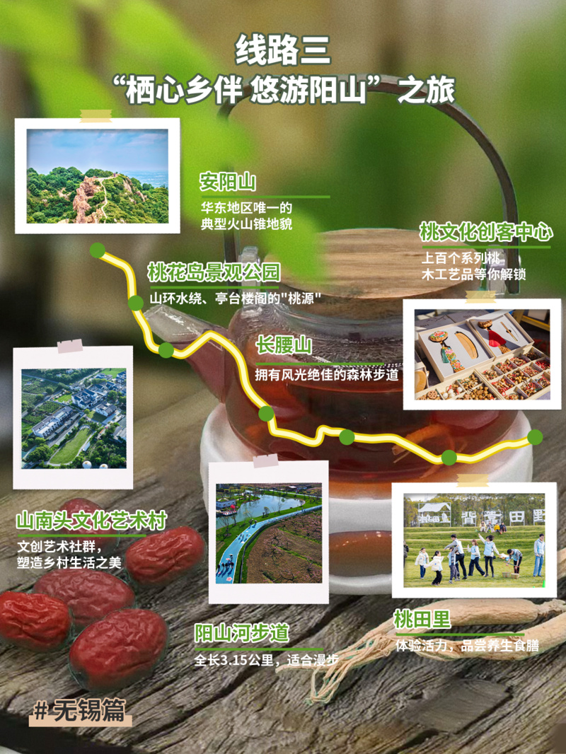 推荐点位:安阳山→桃花岛景观公园→山南头文化艺术村→阳山河步道→长腰山→桃田里→桃文化创客中心