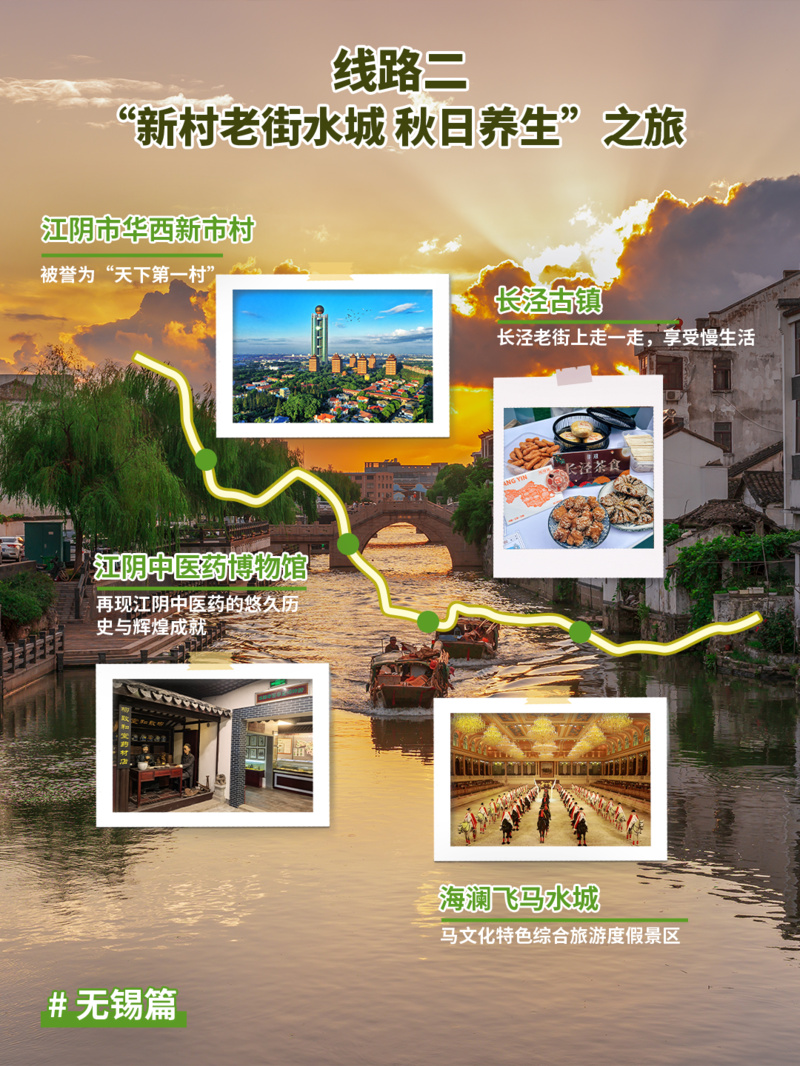 推荐点位:江阴市华西新市村→天华生态园(江阴中医药博物馆)→长泾古镇→海澜飞马水城