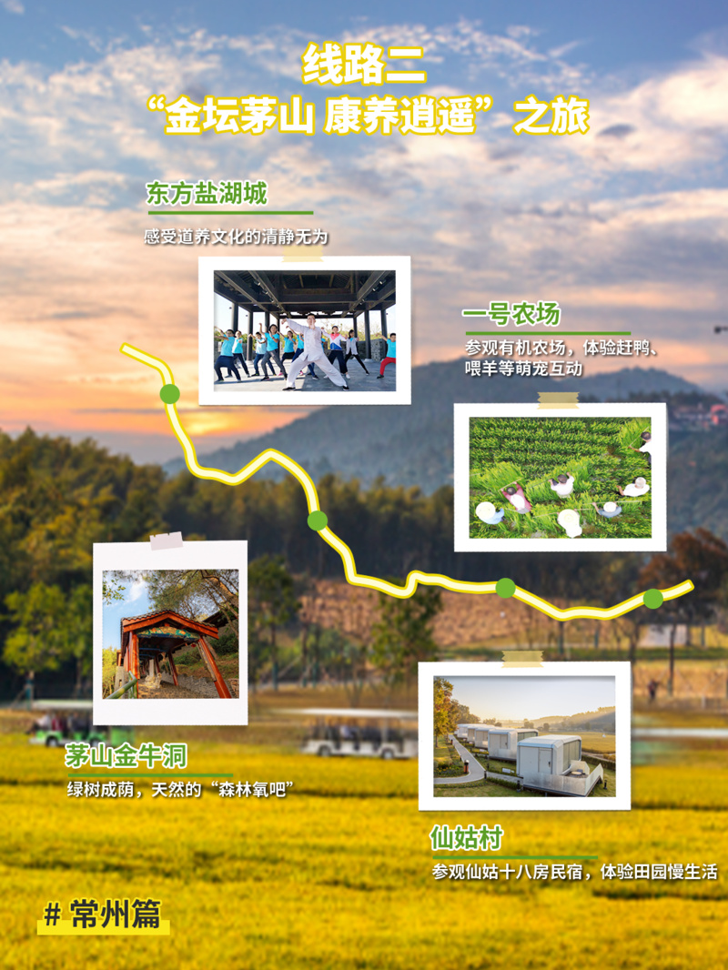 推荐点位:东方盐湖城→茅山金牛洞→一号农场→仙姑村