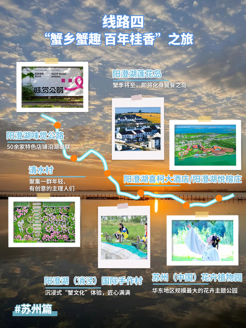 推荐点位:阳澄湖味觉公路→清水村→阳澄湖莲花岛→阳澄湖(消泾)国际手作村→喜柯/悦榕庄→苏州(中国)花卉植物园