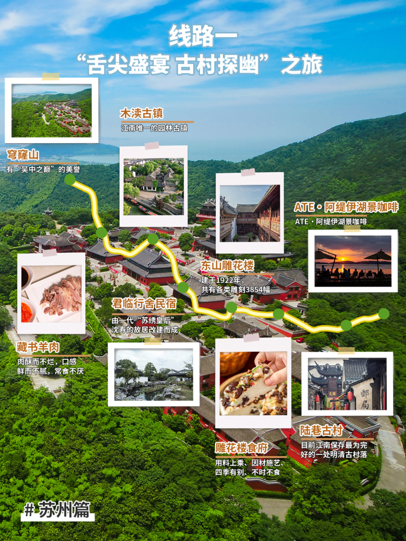 推荐点位:穹窿山→藏书羊肉→木渎古镇→君临行舍民宿→东山雕花楼→雕花楼食府→陆巷古村→ATE・阿缇伊湖景咖啡