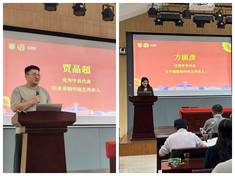 研修班优秀学员代表贾晶超、方丽彦先后上台发言,分享学习感悟与使命担当。阳羡贡茶制作技艺传承人贾晶超以“茶者的使命感”为主题,从“传承、创新、担当”三个维度展开分享。他表示,通过研修深刻领悟到“非遗的当代价值在于‘活在当下’”,未来将以跨界思维推动“非遗+科技”“非遗+美学”融合,践行生态责任、文化责任与经济责任,助力茶产业成为乡村振兴的“绿色引擎”。方丽彦作为黄山太平猴魁非遗代表性传承人,讲述了自己的“问道”与“溯源”之旅。她提到,研修让她跳出“技艺固守”的局限,真正触摸到茶文化的“灵魂与脉络”,未来将既要“沉下去”守护“手不离茶,茶不离锅”的匠心,也要“跳出来”借助科学与人文力量,让传统茶技艺飘香新时代。