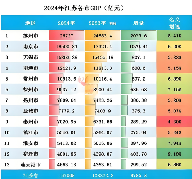 (▲江苏省2024年十三市GDP排名 图源网络)