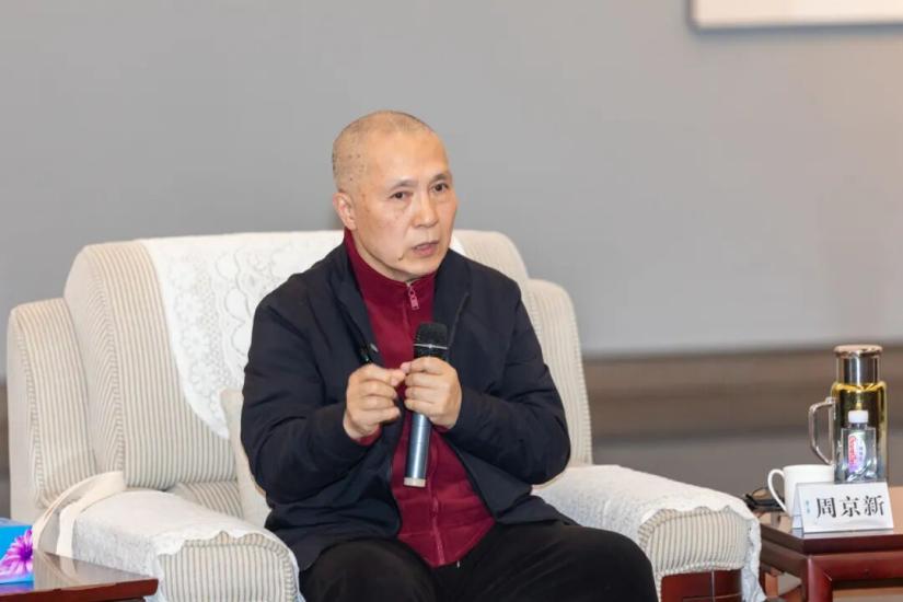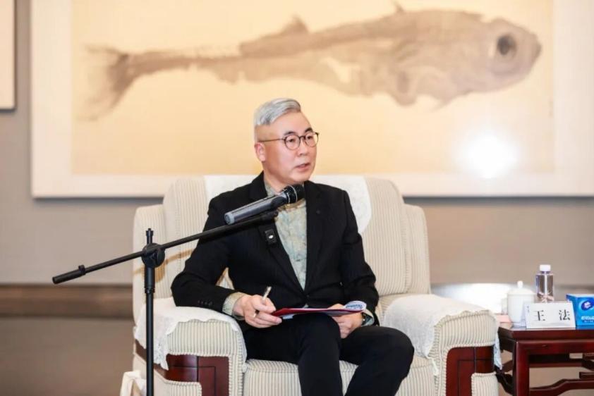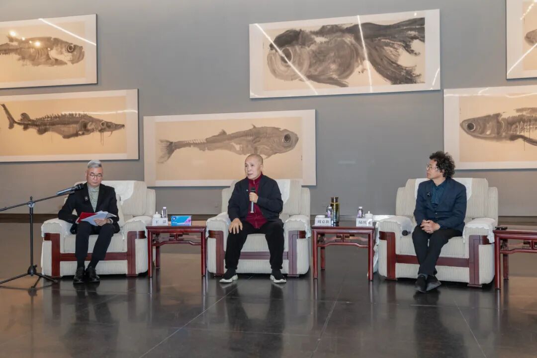 作品捐赠仪式之后,在江苏省美术馆一层展厅举办了“周京新:有鱼”艺术分享会。江苏省美术馆馆长王法首先介绍了展览,作为江苏省美术馆学术邀请展在2025年度的策划个案,“周京新:有鱼”特展集中呈现画家近期全新创作的一系列以大鱼为主题的作品,旨在将寻常视角中的游鱼以宏阔的视觉尺度进行表现,通过凝练与提纯,于纵横挥洒间呈现出笔简意足、气韵充盈的境界。