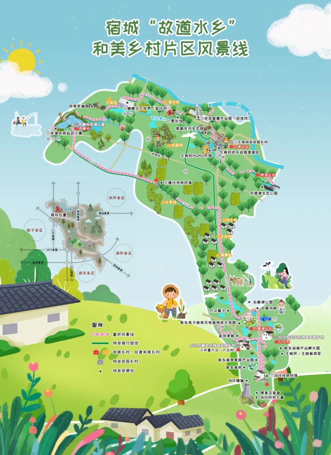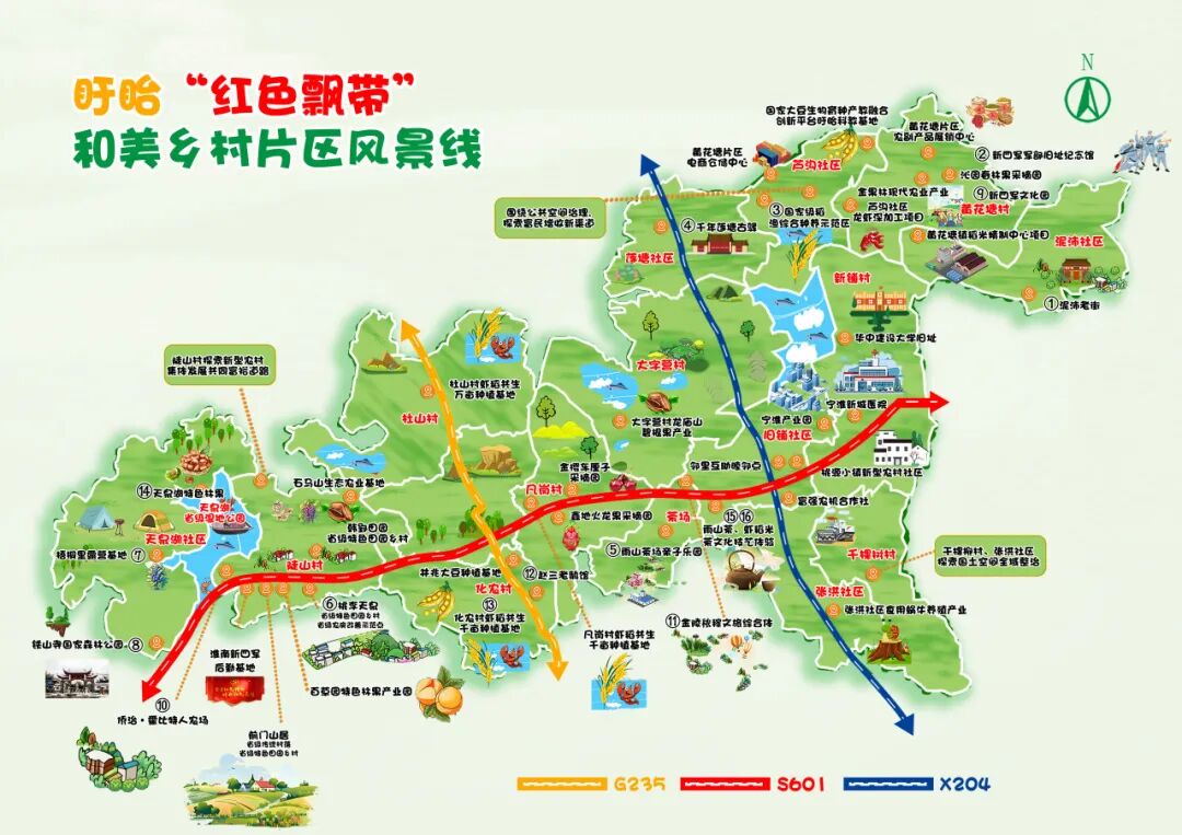 牛角村欢乐田园度假区(牛角村)—牛角淹和美乡村(牛角村)—田洼智慧产业园(田洼村)—蝴蝶兰大世界(苗圩村)—朱海休闲运动小镇(尹黄村)—唐圩传统村落—刘圩传统村落—共富大众(大众村)