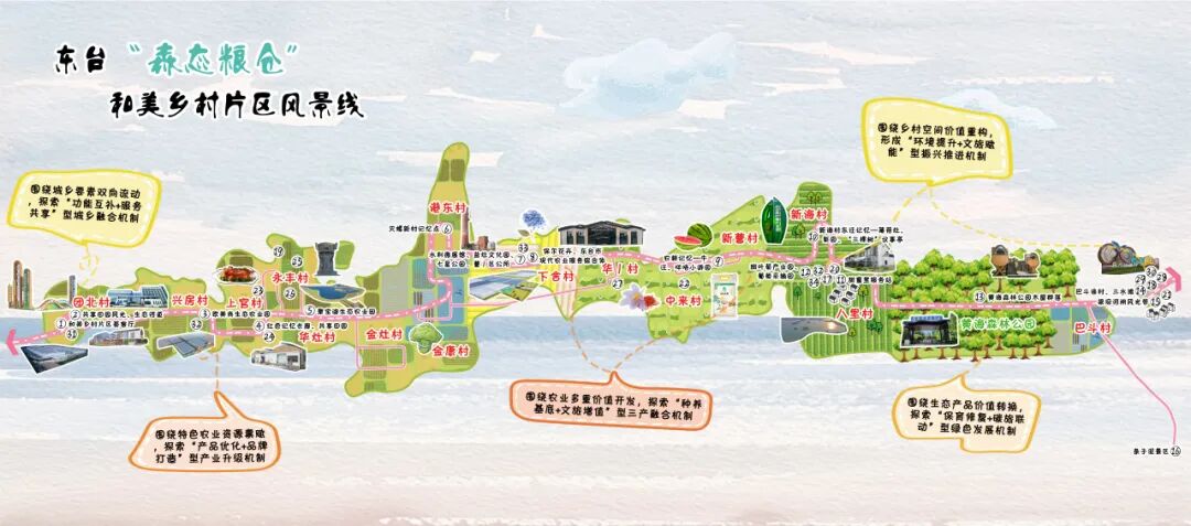 和美乡村片区荟客厅—共享田园风光、生态河道(团北村)—欧美尚现代农业园(兴房村)—红色记忆长廊、共享田园(华灶村)—聚宝湖生态农业园(永丰村)—灭螺新村记忆点(港东村)—水利微展馆、盐灶文化园、七星公园—保尔花卉、东台市现代农业服务综合体(下舍村)—农耕记忆—牛汪咩咯小游园(新曹村)—新海村东迁记忆—薄荷社、梨园、“三棵树”议事厅(新海村)—甜蜜里服务站、甜叶菊产业园、葡萄采摘园(八里村)—黄海森林公园—巴斗渔村、三水滩—梁垛河闸风光带—条子泥景区
