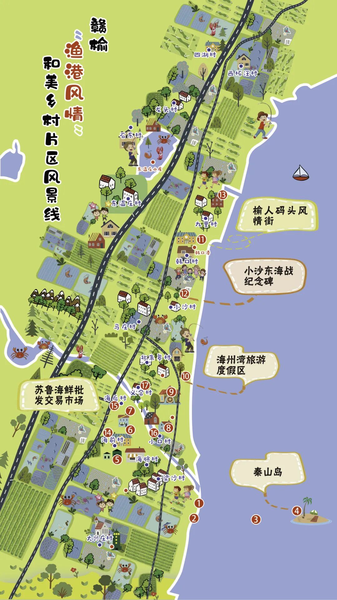 2、海头镇海滨大道:海脐激战旧址(海脐村)—海头镇海鲜电商产业园(海前村)—苏鲁海鲜批发交易市场(海后村)—朱蓬口市场(小口村)—海底世界、水上乐园(小口村)—海州湾旅游度假区(小口村)