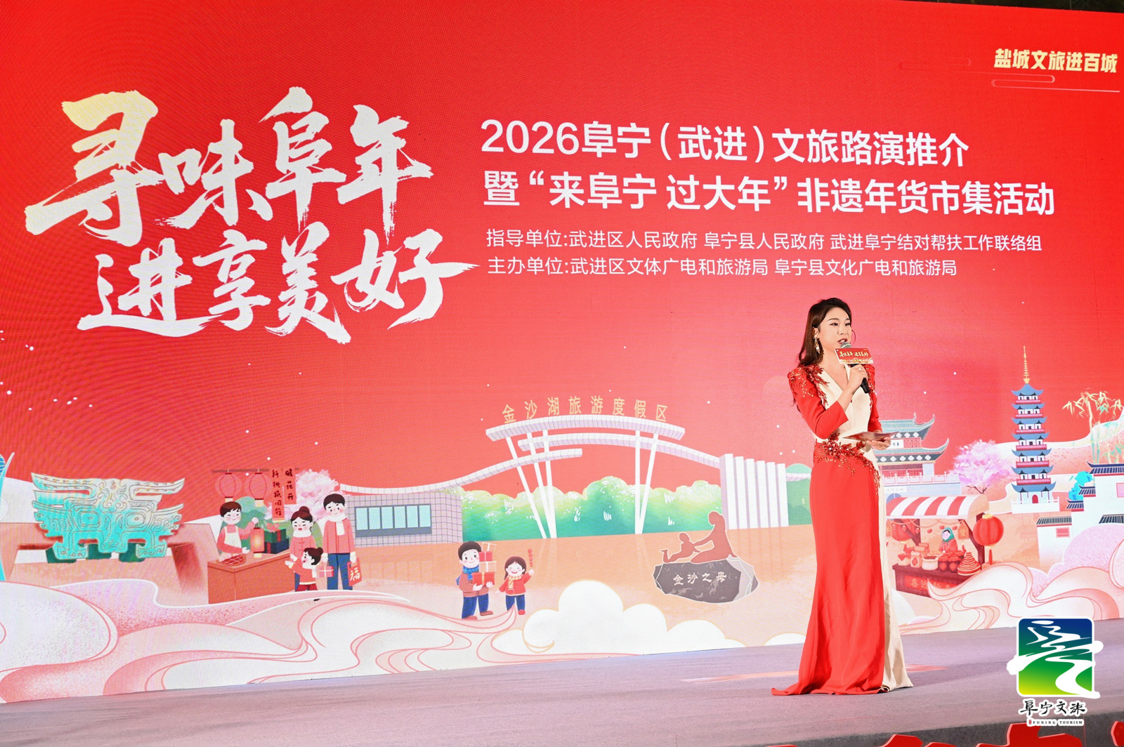 1月30日,2026阜宁(武进)文旅路演推介暨“来阜宁 过大年”非遗年货市集活动在武进万达广场热闹开市。本次活动由武进区人民政府、阜宁县人民政府、武进阜宁结对帮扶工作联络组共同指导,武进区文体广电和旅游局、阜宁县文化广电和旅游局联合主办。