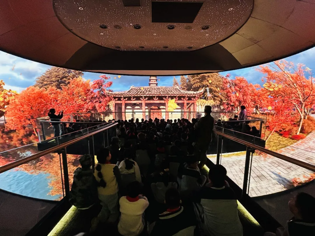 整个展馆最震撼的体验,莫过于核心展项——国内唯一的球幕CAVE“高淳之心”。站在直径17米的巨大球幕之中,225度超环绕沉浸影像将你温柔包裹,高淳的山水画卷、岁月变迁与未来规划近在眼前,仿佛进行一次全景漫游。