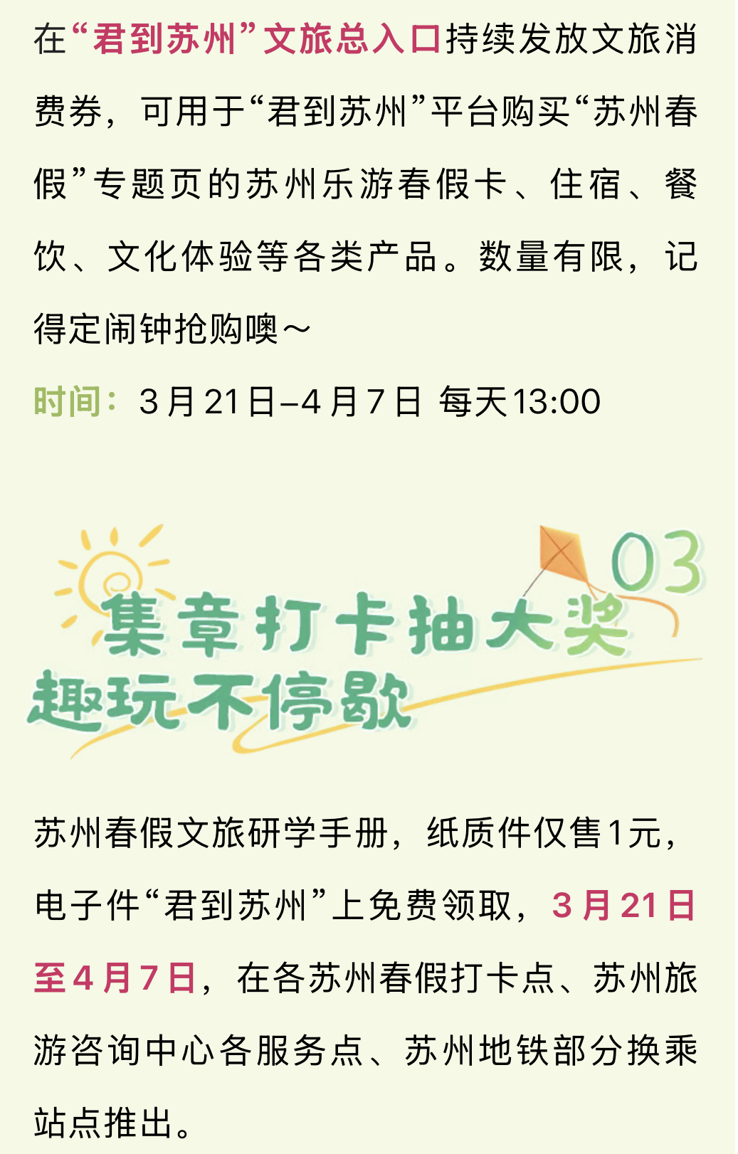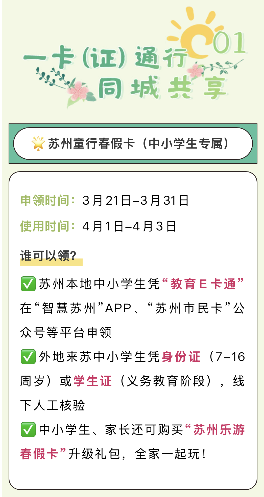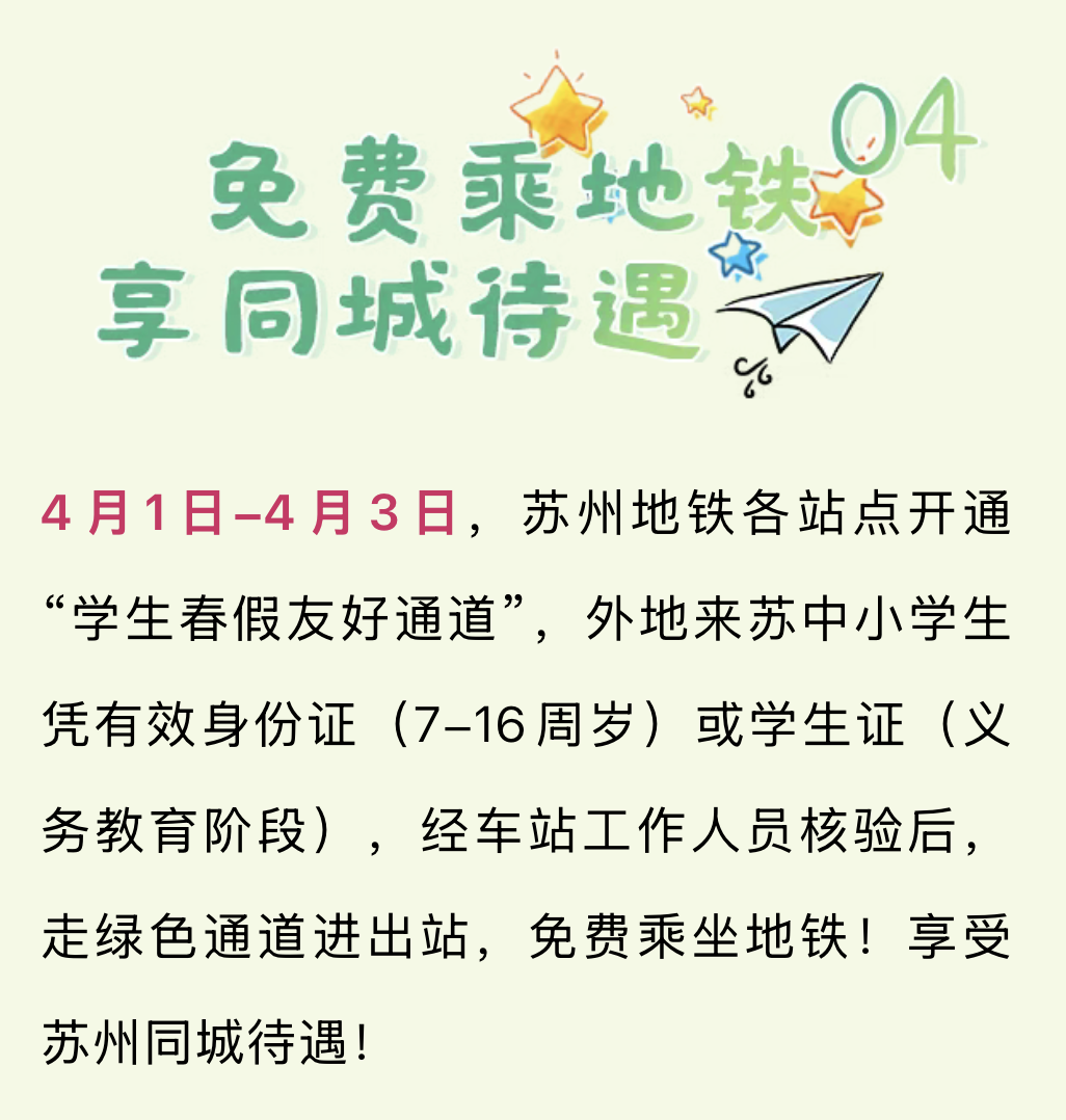 苏州给全国中小学生准备了“超大份”文旅礼包。苏州春假一卡通行、文旅专属消费券、免费乘地铁、免费坐游船……还有超多好玩的研学体验活动、集章打卡抽大奖、一日托管服务,就等你来“探寻一春江南”。