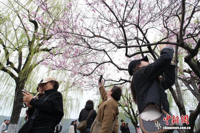 3月20日,杭州西湖白堤桃花初绽、柳丝新绿,吸引游客踏青赏花。曹丹 摄