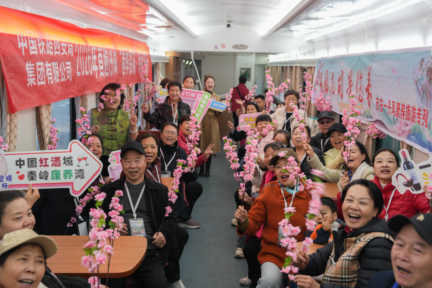 在中国铁路西安局开行的赏花列车上,身着桃花仙子服饰的工作人员表演了商洛花鼓戏,引来阵阵叫好。“我们还在车上组织了秦腔表演、红酒品鉴等活动,让游客在赏花途中提前感受春日气息与地域文化魅力。”西安铁道国际旅行社营销主管薛心如说,赏花列车一改旅途的单调,实现了“车在路上行、人在景中游”。
