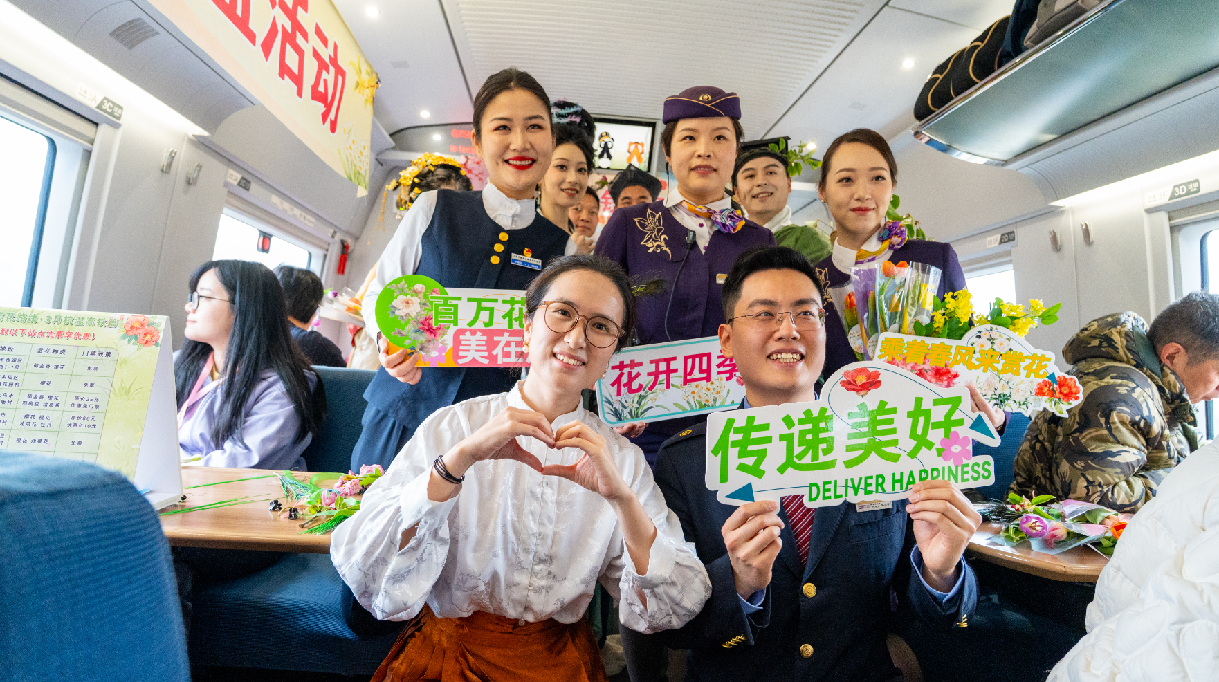 更让吴颖惊喜的是,乘务人员为她戴上了泉州蟳埔女簪花围头饰。“列车还专门布置了赏花主题空间,满是粉色的花束。窗外是流动的花海,车内是触手可及的春意,还没到目的地,春天的气息就已经扑面而来。”吴颖说。