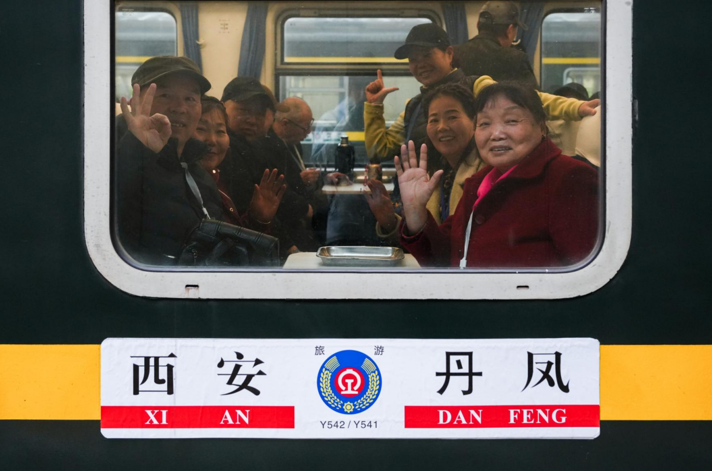 3月21日,西安铁路局开行2026年首趟丹凤“春季赏花”旅游专列,图为出发前,旅客在西安站合影。 薛心如摄