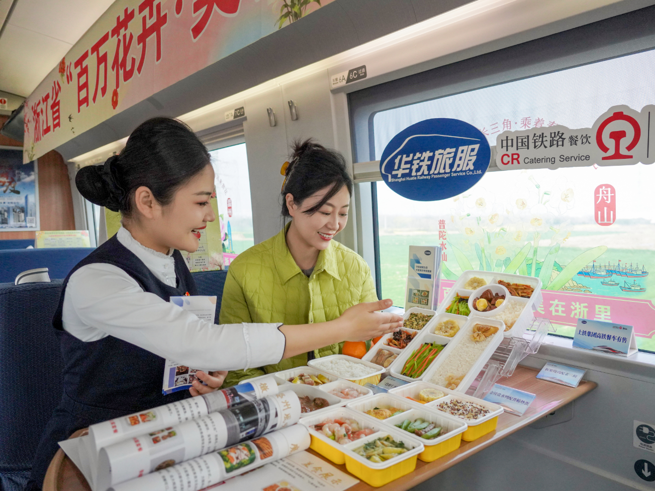 前不久,在杭州西站候车大厅里,工作人员向过往旅客赠送郁金香,旅客陈女士捧着鲜花走进车厢,一连串体验让她满是欣喜:“还没上高铁就收到鲜花,杭州的春天太浪漫了!登上G7581次列车后,一眼就看到了桂花、茶花装点的车窗,旅途中还吃到了鲜嫩爽脆的春菜、软糯香甜的青团,这种体验既沉浸又浪漫。”