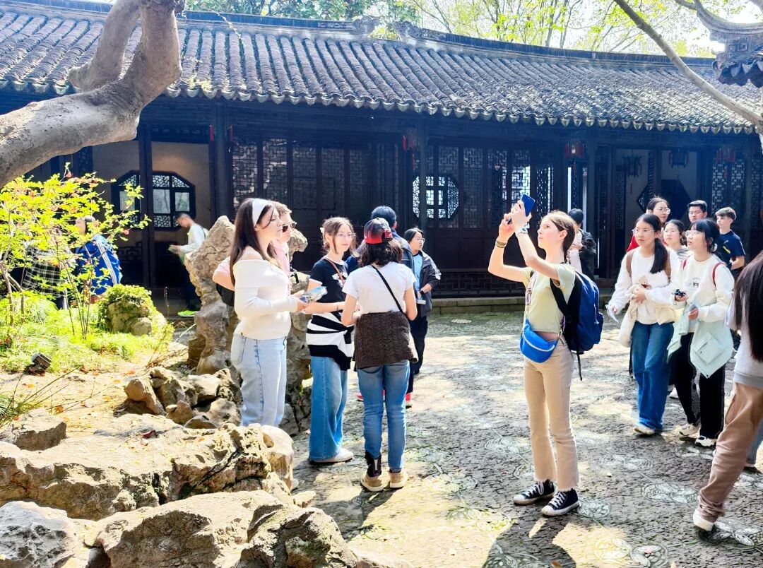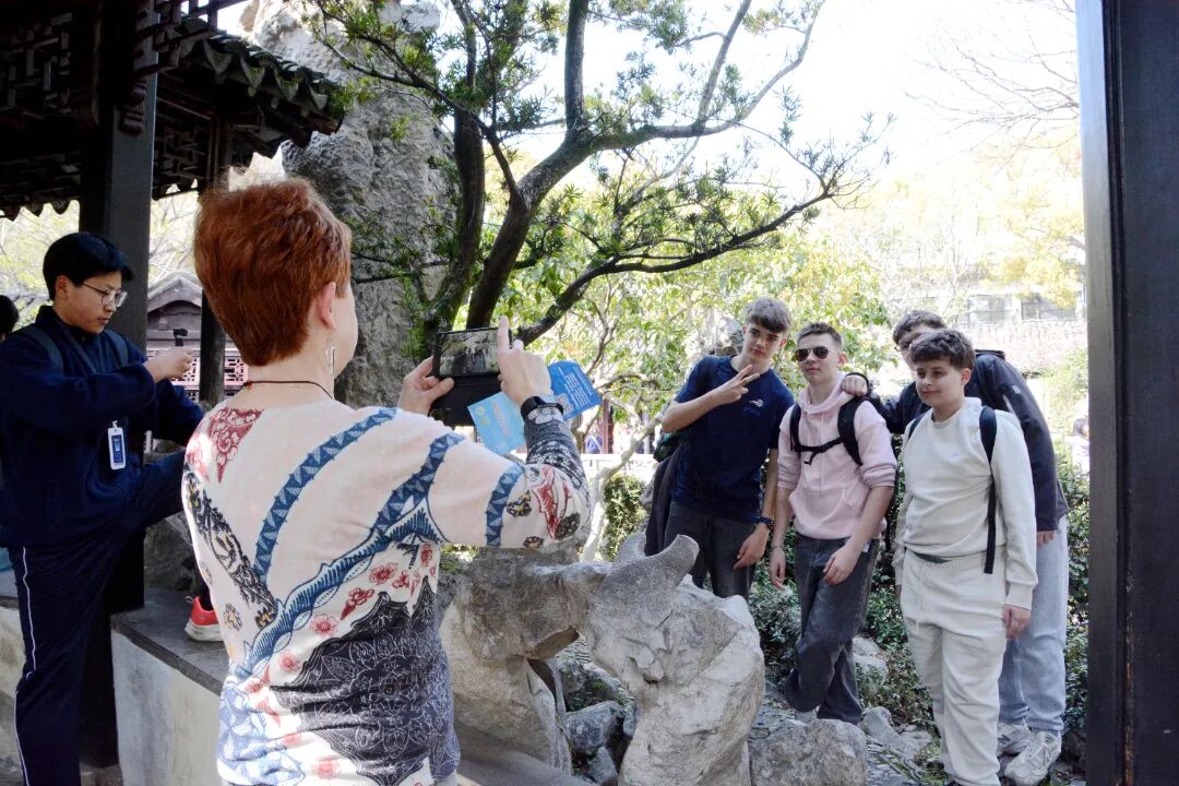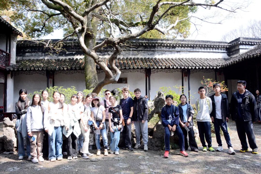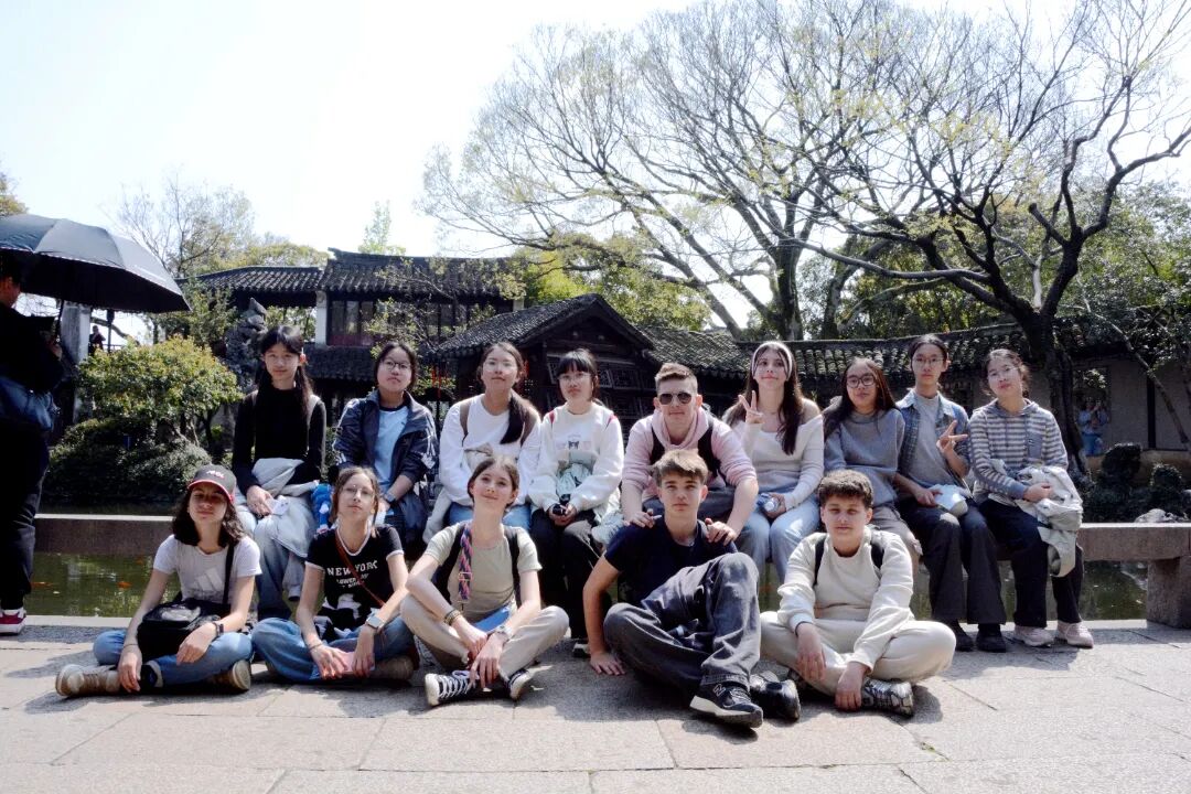 随后,中法学生在退思园的百年树木下合影留念,镜头定格了跨越山海的青春笑脸。