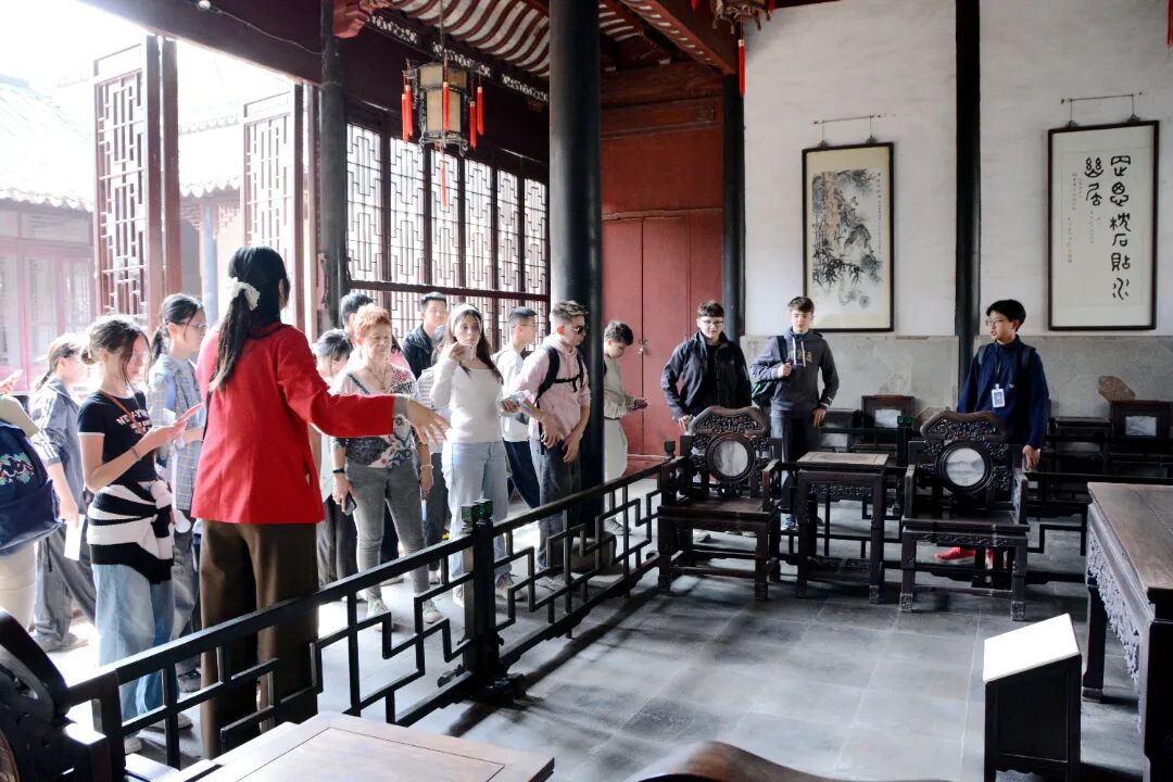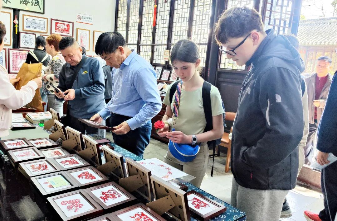 在退思园内,学生们对园林造景、同里剪纸文化充满好奇,吴江实验初中的同学们用略显生涩却热情洋溢的英语,与法国同学互动交流,还送上了贴心的古镇特色小礼物,友谊愈发深厚。