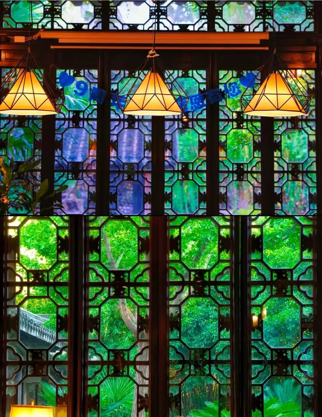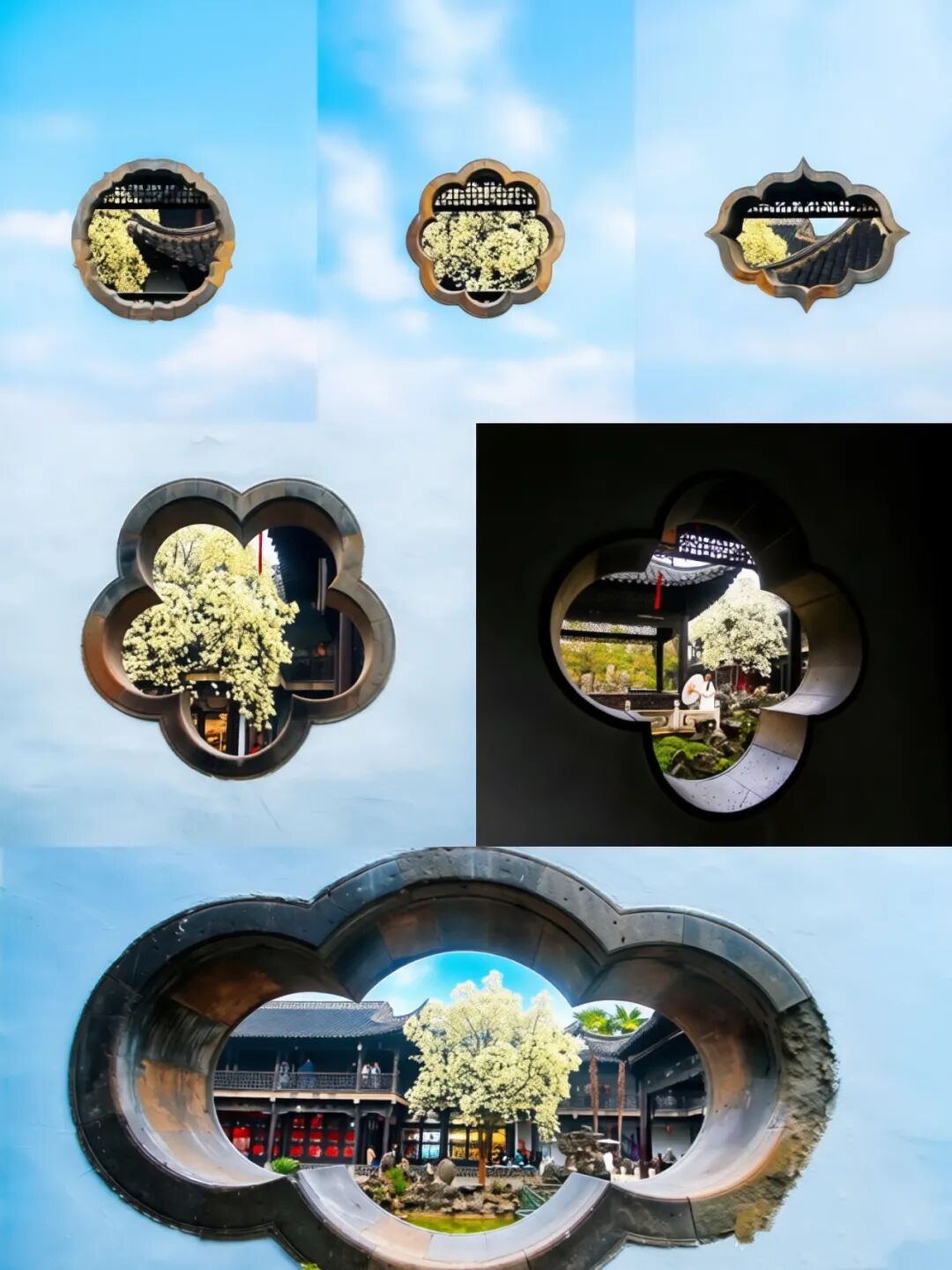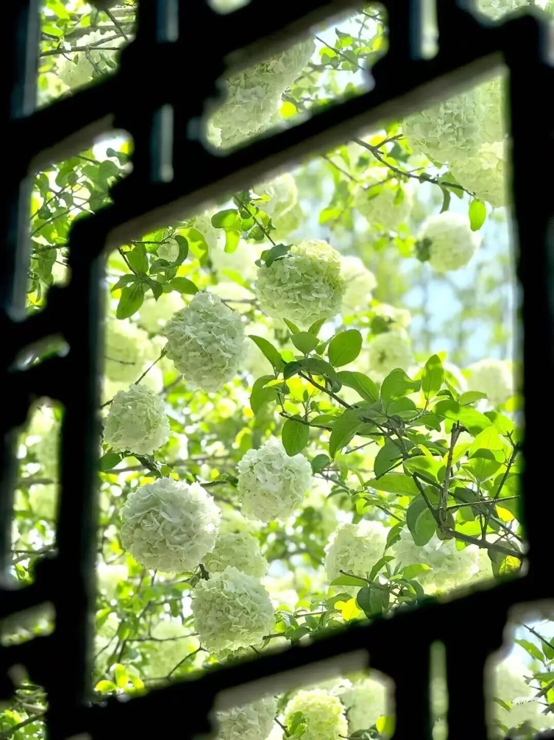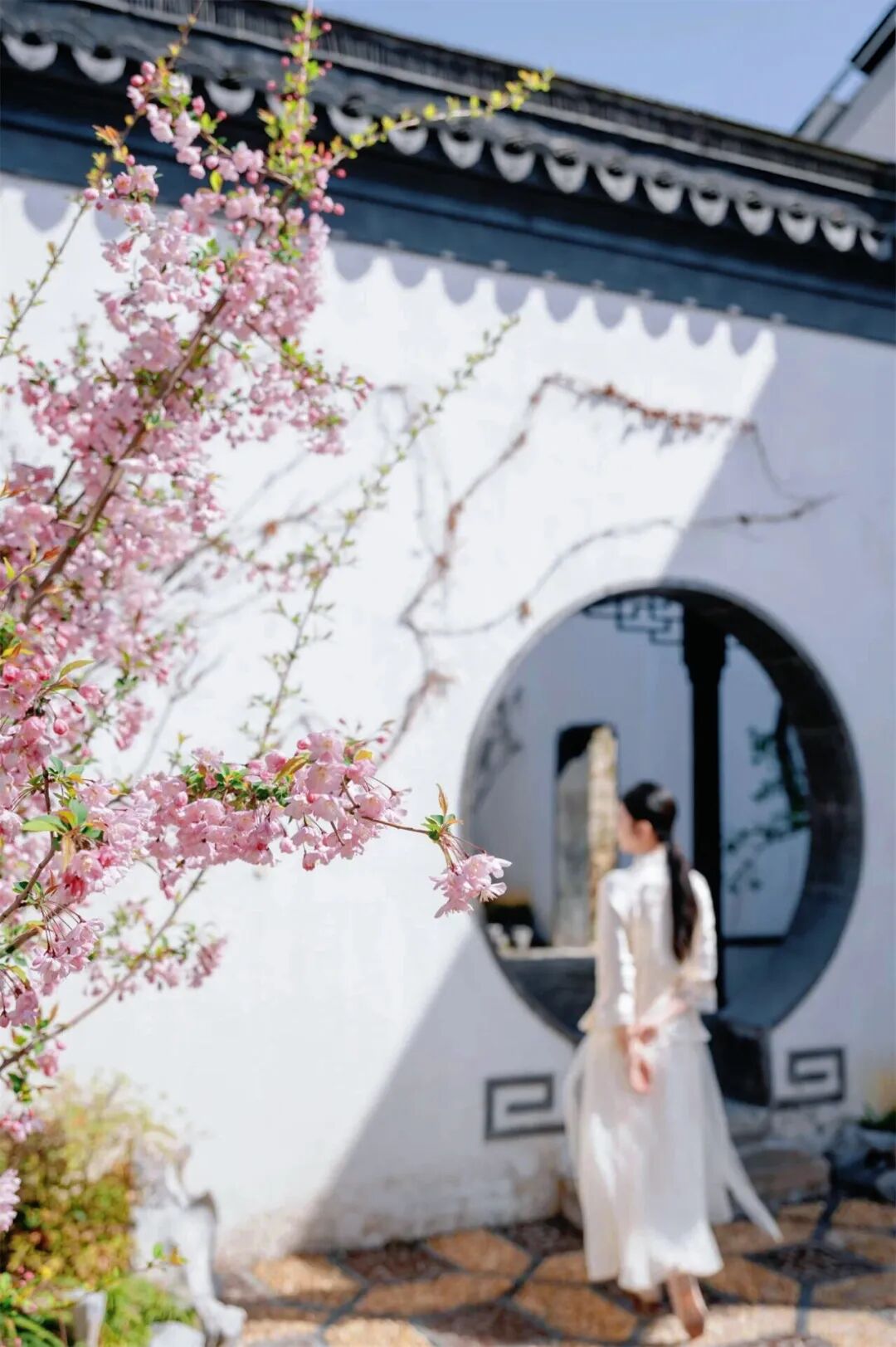 春日里,紫藤爬满廊架,海棠、玉兰、桃花次第绽放,花瓣落在窗棂上,风一吹,花影在粉墙黛瓦间摇曳,一步一窗皆成画。