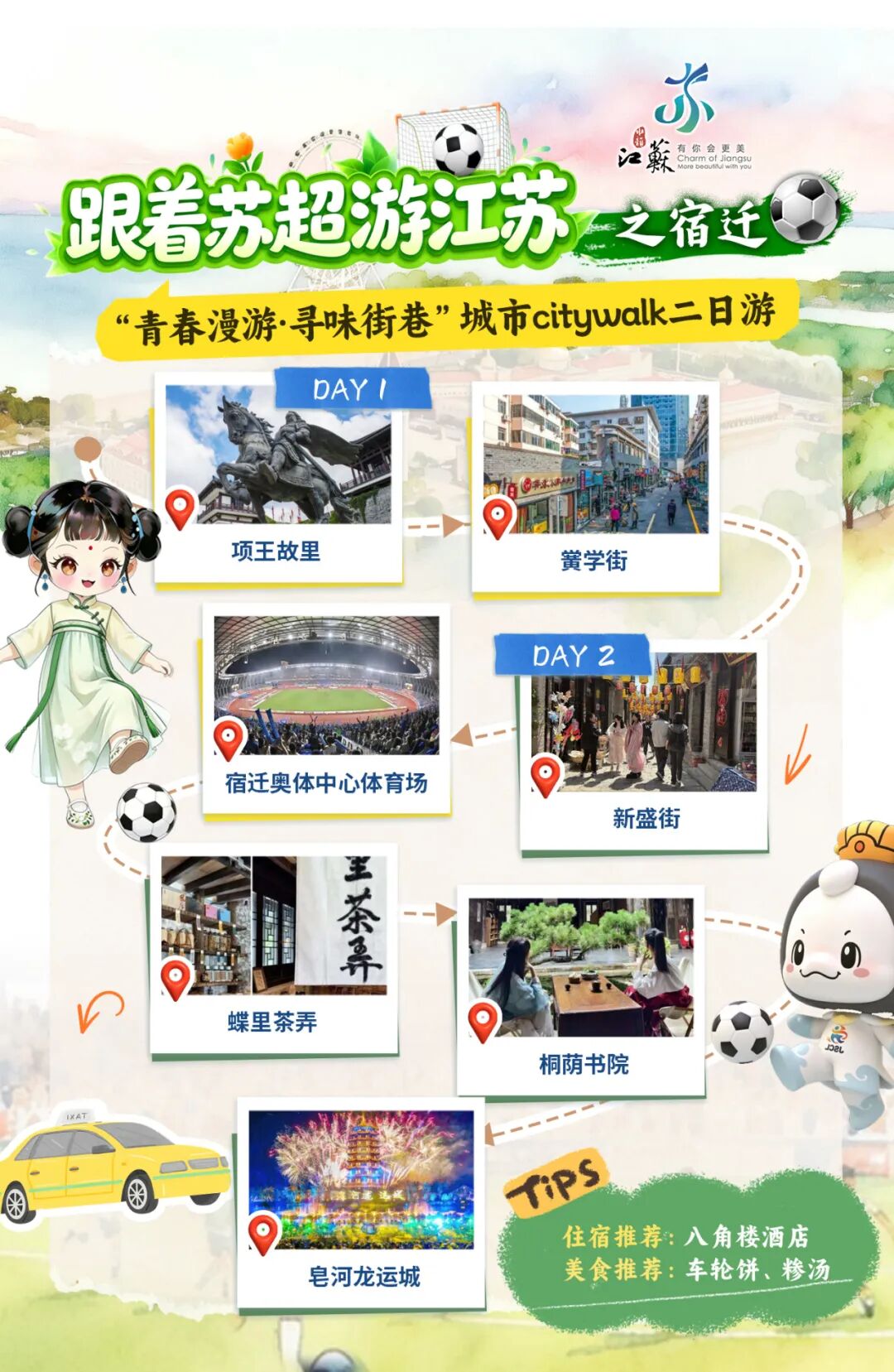 这条为“城市漫游者”量身打造的轻旅线路,不赶路、不扎堆打卡,观赛之余,带你从容穿行 ——从项王故里的红墙黛瓦,逛到黉学街的文创潮店;从新盛街的茶馆戏台,漫步至风情满满的皂河龙运城。用两天一夜,吃遍地道风味小吃,打卡市井烟火,在古城温柔夜色里,解锁宿迁独一份的松弛自在。
