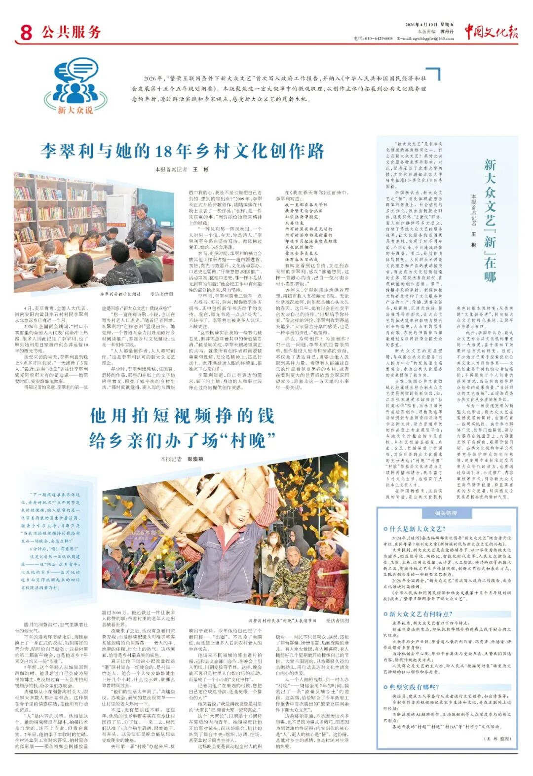 李国新认为,新大众文艺之“新”,首先体现在服务群体的拓展上。社会结构的多元分化,催生出新就业群体、银发群体、“Z世代”群体、素人创作群体等多元受众,打破了传统大众文艺的服务边界,让文化服务的范围更具普惠性,实现了对不同年龄、不同职业、不同地域群体的全覆盖。第二,创作主体的转变。人民群众不再是文化服务和产品的被动接受者,而是成为文化创新创造的主体,展现出自我赋权、自我赋能的创作态势。第三,传播手段的革新。新媒体技术的普及重构了文化服务和产品的生产、传播、消费全链条,短视频、沉浸式体验、算法推荐等新形式,让大众文艺的触达效率和影响力提升到全新高度,大山里的原生态山歌、农民的书画作品都能通过互联网获得全国受众的喜爱。