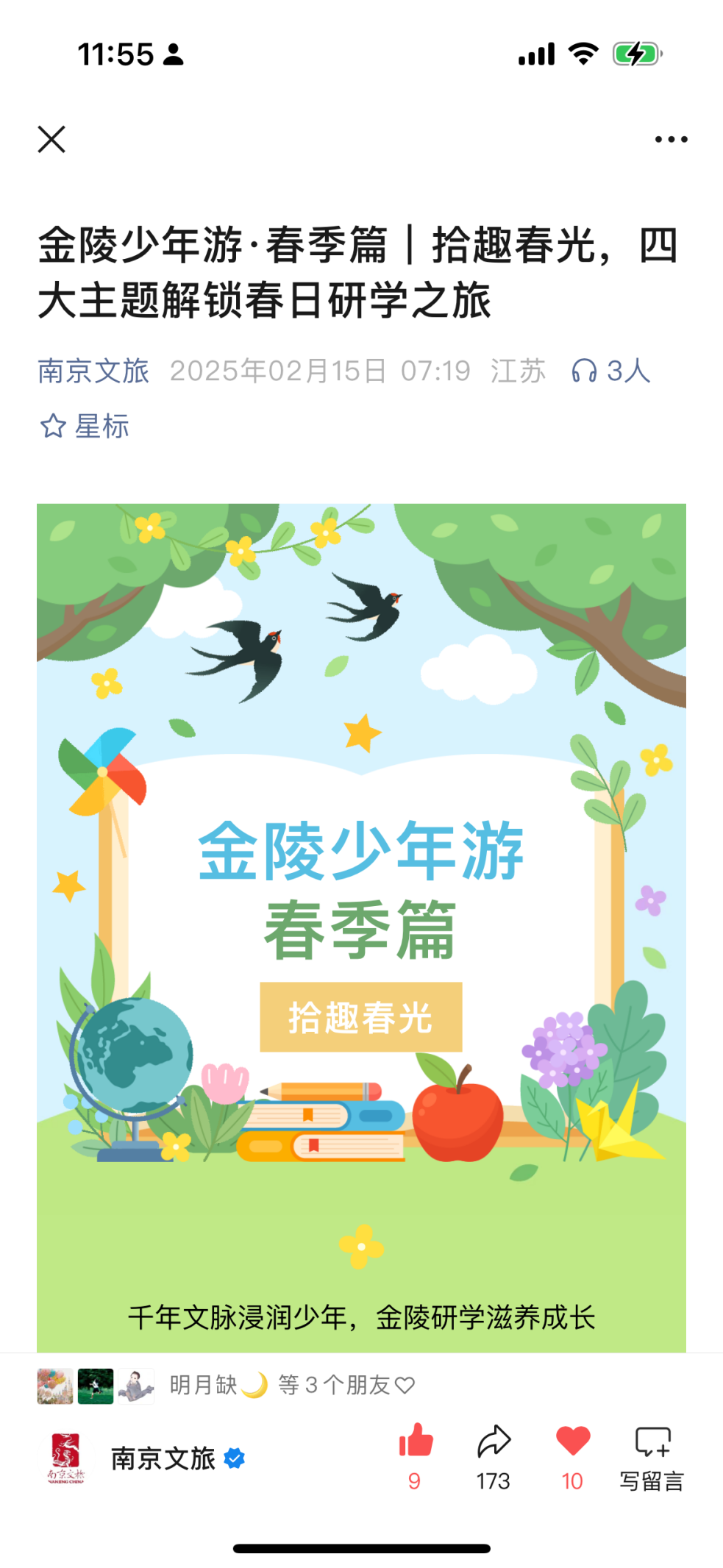 立足南京底蕴,南京市文旅局以研学为桥梁,强调“研”与“学”的深度结合,成功打造了“研学南京 成长旅行”统一的研学旅游品牌。2025年上半年策划了“金陵少年游”四季研学线路及产品,通过整合应季赏花、生态自然、节气文化、文学艺术等类别推出春季篇“拾趣春光”,并围绕文博探索、励志拓展、红色寻访、夏令营等类别推出夏季篇“筑梦当夏”,于南京文旅官方信息平台及合作媒体宣推产品80余个,宣传报道覆盖各级媒体60余家,为广大青少年提供了优质的校外教育实践平台,满足了素质教育的新需求。