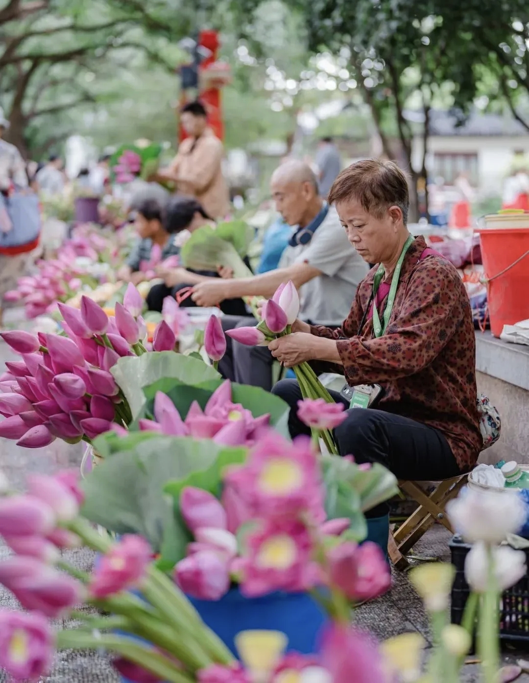1.深挖在地资源,丰富主题内涵。以“荷花”为连接点,上连太湖农户荷花种植生态链,下接江南“可采莲”民俗文化,形成“生态供给—文化转化—旅游消费体验”的闭环。市集不仅销售新鲜荷花、莲蓬,更还原苏州“种荷、赏荷、爱荷”传统,通过荷花花艺展示、荷文化科普等内容,让生态资源与文化旅游内涵深度绑定。生动诠释了“文旅融合”的发展逻辑——让传统文化以更鲜活的方式走进现代生活,也让城市旅游消费场景更具苏式生活美学的文化质感。
