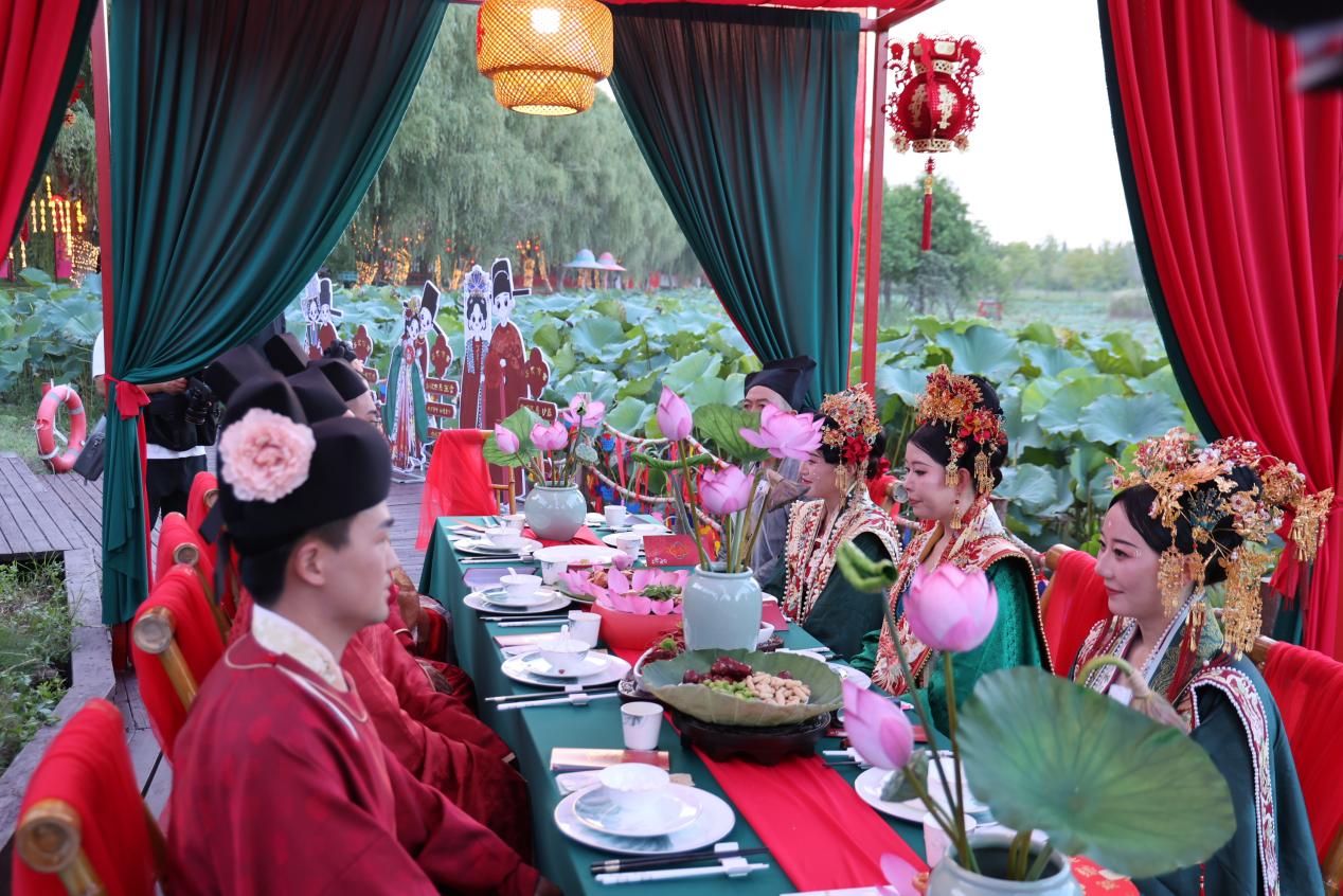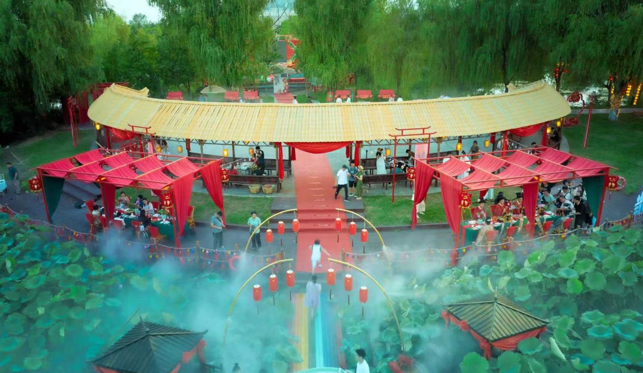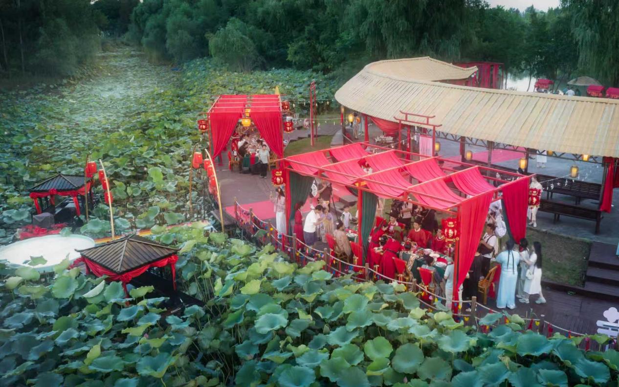 2.构建标志性活动体系,提升公众参与度。节庆的高潮是一个或者数个标志性的活动,这样才能真正激发群众的参与热情,内容与形式充分考虑群众的可参与性。洪泽湖湿地水上婚礼秀活动联合政府部门构建服务矩阵。与泗洪县民政局设立洪泽湖湿地现场婚姻登记点,实现“仪式+领证”一站式服务,与泗洪县总工会、泗洪县妇女联合会设立相亲角,提供婚恋匹配与婚礼咨询服务。整合餐饮、住宿、文创等资源,推出“场地+仪式+餐饮”套餐,开发以荷花、芡实等湿地食材为主的“如荷是好”囍宴,结合荷叶茶、刻纸门花、半城布老虎、卢大银大糕等非遗产品定制伴手礼。带动市场经济的同时,提升洪泽湖湿地景区文化知名度和地区美誉度;促进“特色文旅”的发展的同时,传承和弘扬洪泽湖历史文化,延续历史文脉,增强民众文化自信,既实现了物质层次的民俗要素,又回应了精神层面的民俗要素。