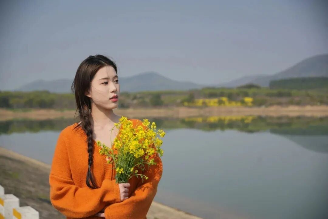 微风清拂香四溢,亭亭玉立倚栏杆,