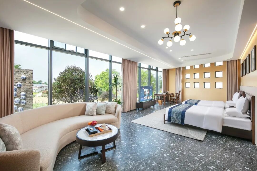 民宿以“非遗+艺术+田园”为核心特色,内部陈列非遗艺术品,营造出“美术馆式”的沉浸式空间;这里不仅有现代设施,更提供管家式服务,推窗即见田园风光;配套项目丰富,涵盖围炉煮茶、露天烧烤、篝火晚会、农家体验等,还设有觅见音乐酒吧。