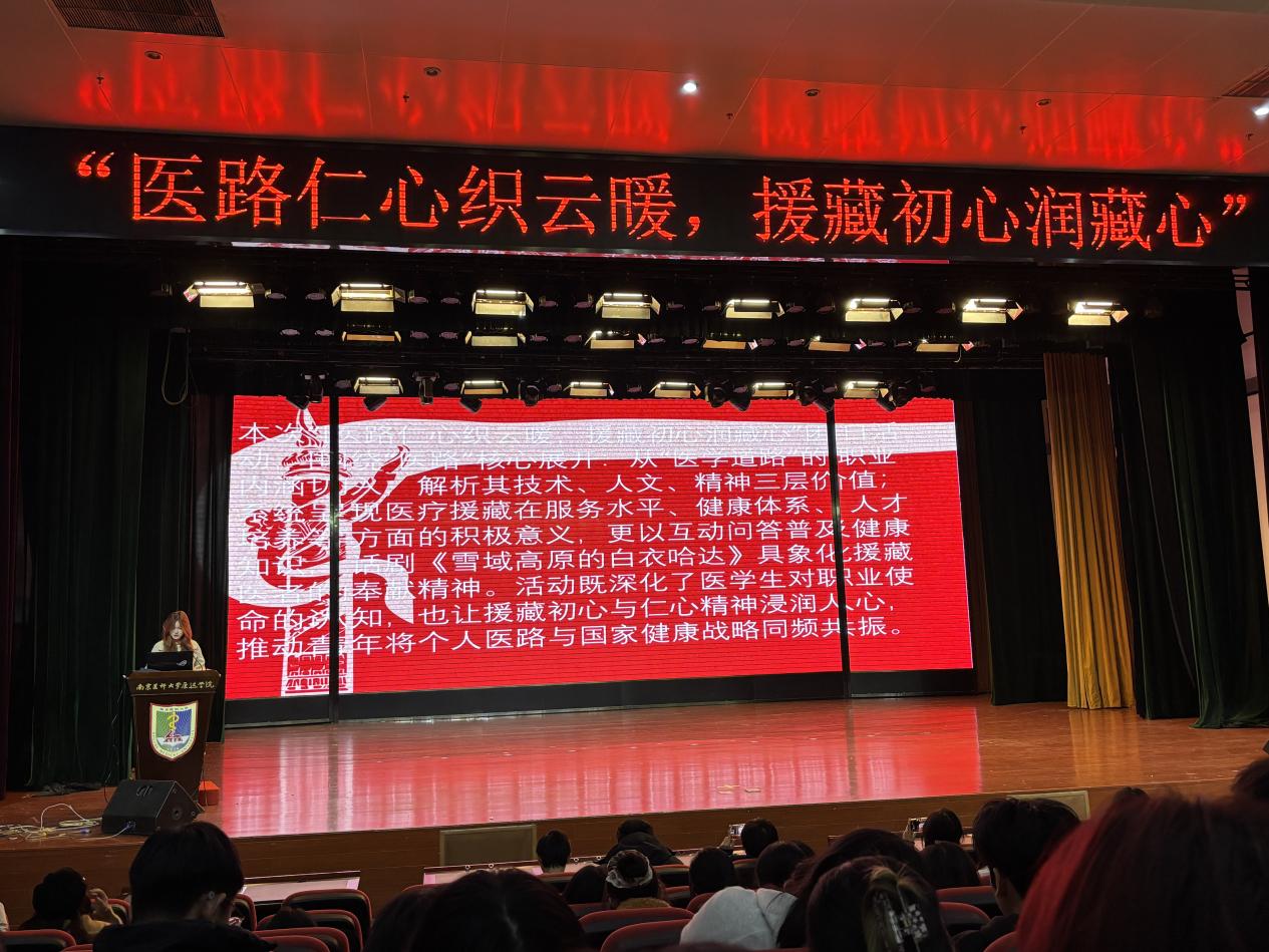 新华日报·中国江苏网讯 “心率不齐,血氧饱和度只有85%!快,吸氧!卓玛,准备静脉通路!”这段紧急施救的对话,并非发生在青藏高原,而是回荡在南京医科大学康达学院的大礼堂里。日前,医学信息工程学部面向全体学生开展了“医路仁心织云暖,援藏初心润藏心”团日活动,学生以自编自演的话剧《雪域高原的白衣哈达》拉开沉浸式序幕,将远在千里之外的援藏医疗故事,真切地搬到了同学们眼前。